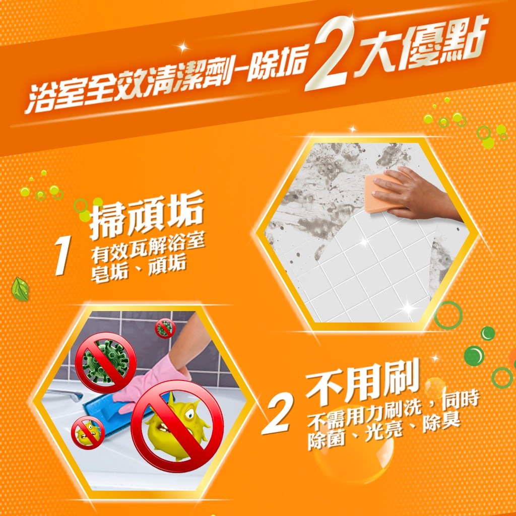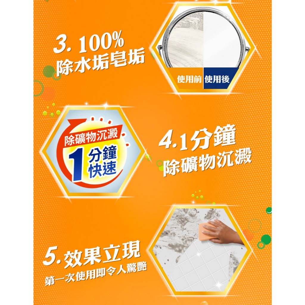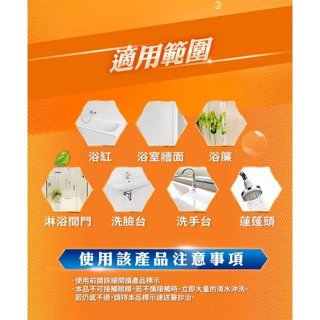 - 輕鬆去除浴室頑固水垢,省時省力,清潔效果看得見