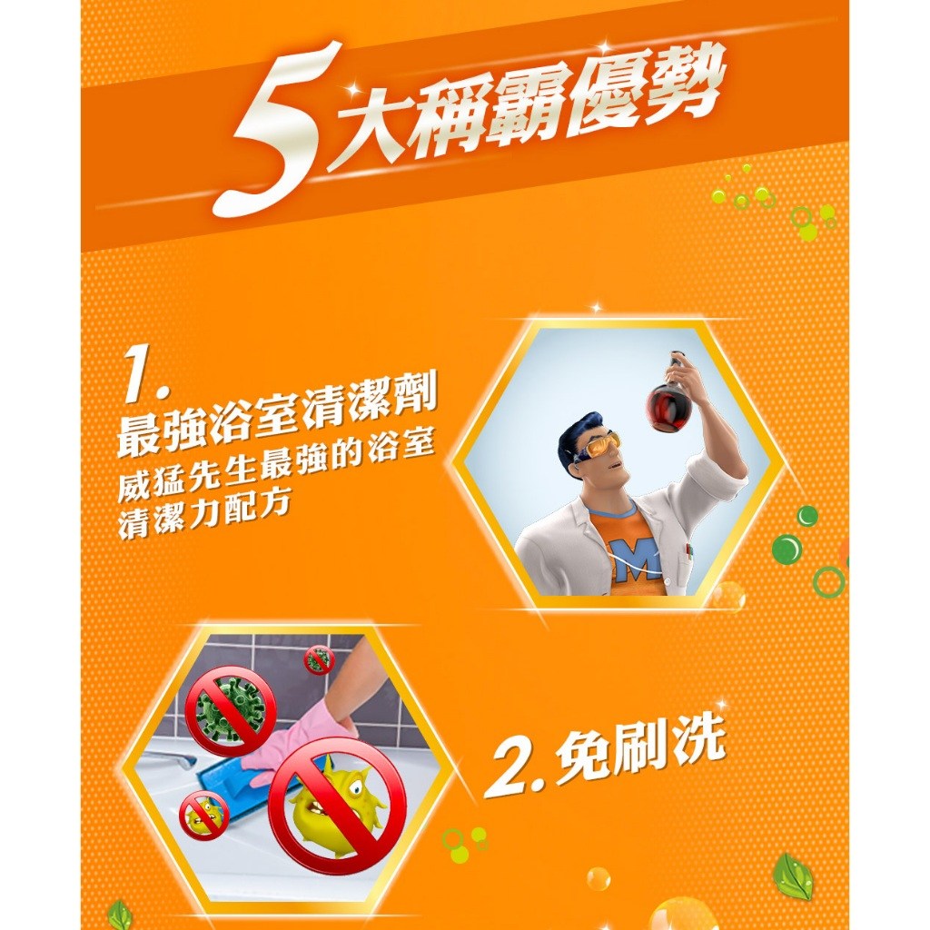 - 威猛先生浴室清潔劑,輕鬆噴灑,迅速滲透頑固水垢,讓浴室煥然一新。