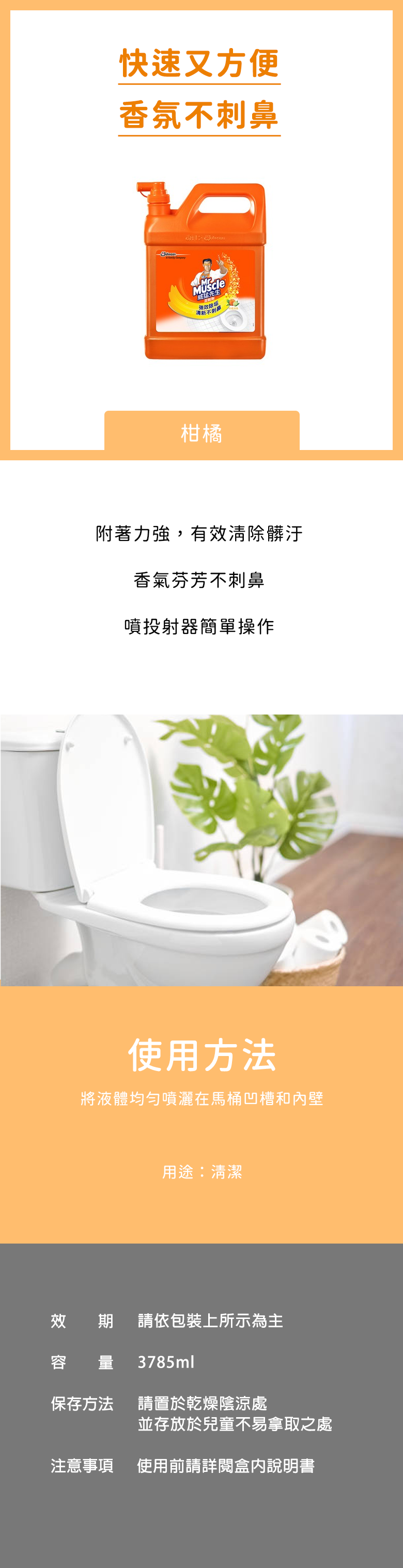 - 威猛先生潔廁劑,輕鬆去除馬桶污垢,讓您的浴室煥然一新,散發清新柑橘香氣。