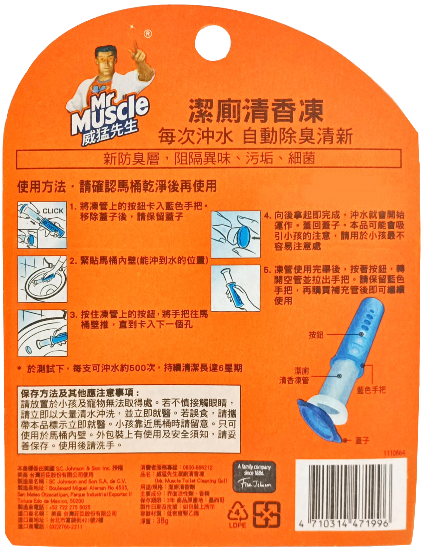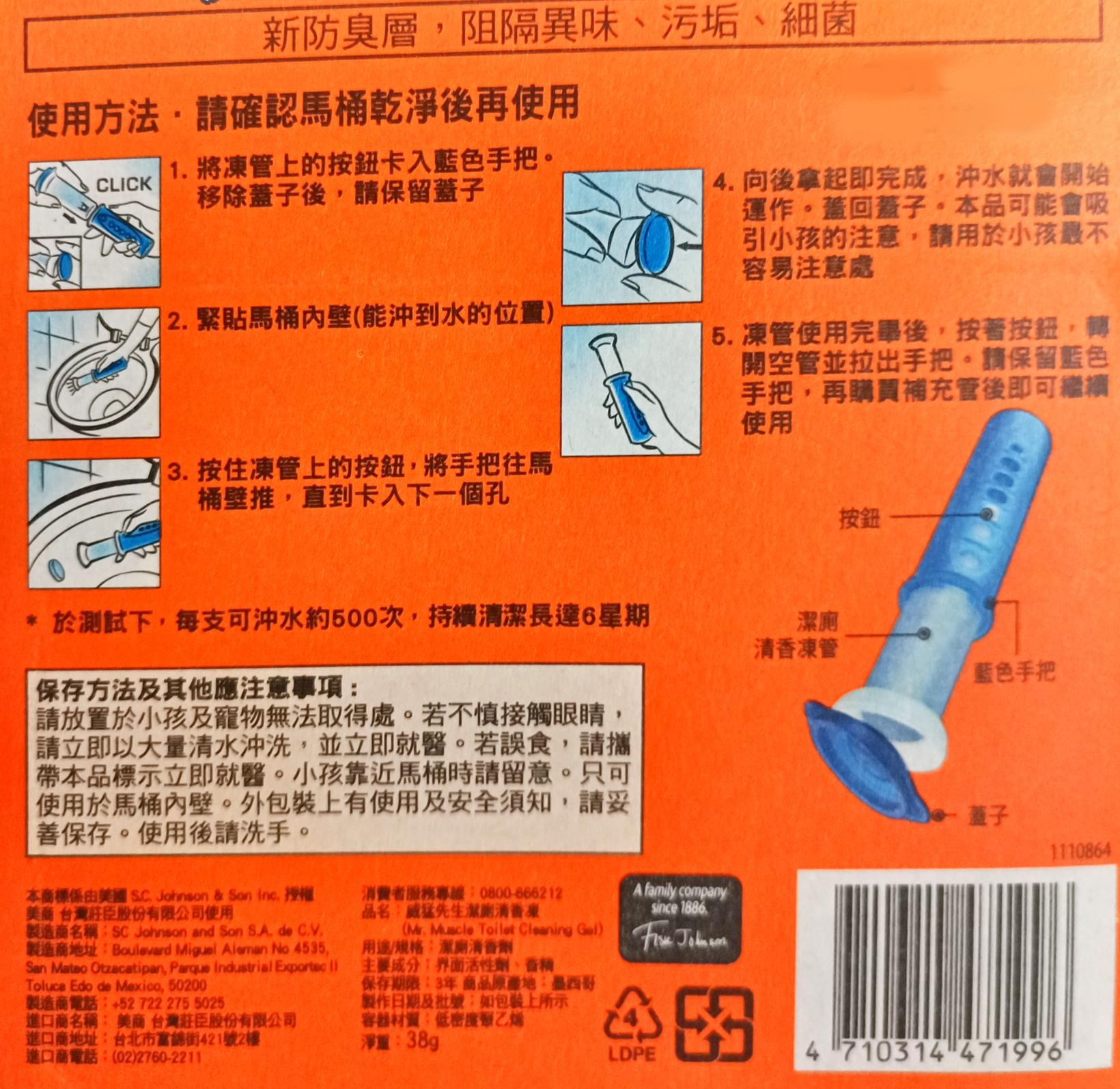 - - 清潔凍緩釋技術,長達六週持續散發香氣,省時省力,維持廁所清新。