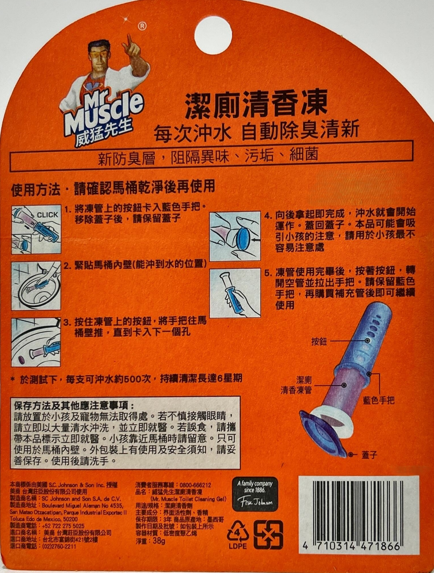 Mr Muscle 威猛先生潔廁清香凍,讓您的馬桶持久保持清新潔淨。獨特凝膠配方,每次沖水自動釋放淡雅薰衣草香氛,有效去除異味,讓廁所空氣清新怡人。組裝簡單,只需將凝膠管卡入手把,輕鬆推入馬桶內壁即可。每管凝膠可使用長達6週,省時省力,讓您告別頻繁清潔的煩惱。威猛先生潔廁清香凍,是您維持廁所清潔、散發宜人香氣的最佳選擇。