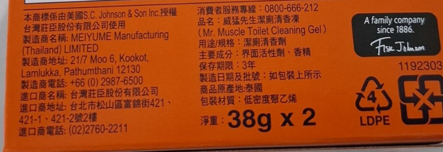 - 威猛先生凍狀質地,每次沖水釋放潔淨成分,讓馬桶持久保持清新花香。