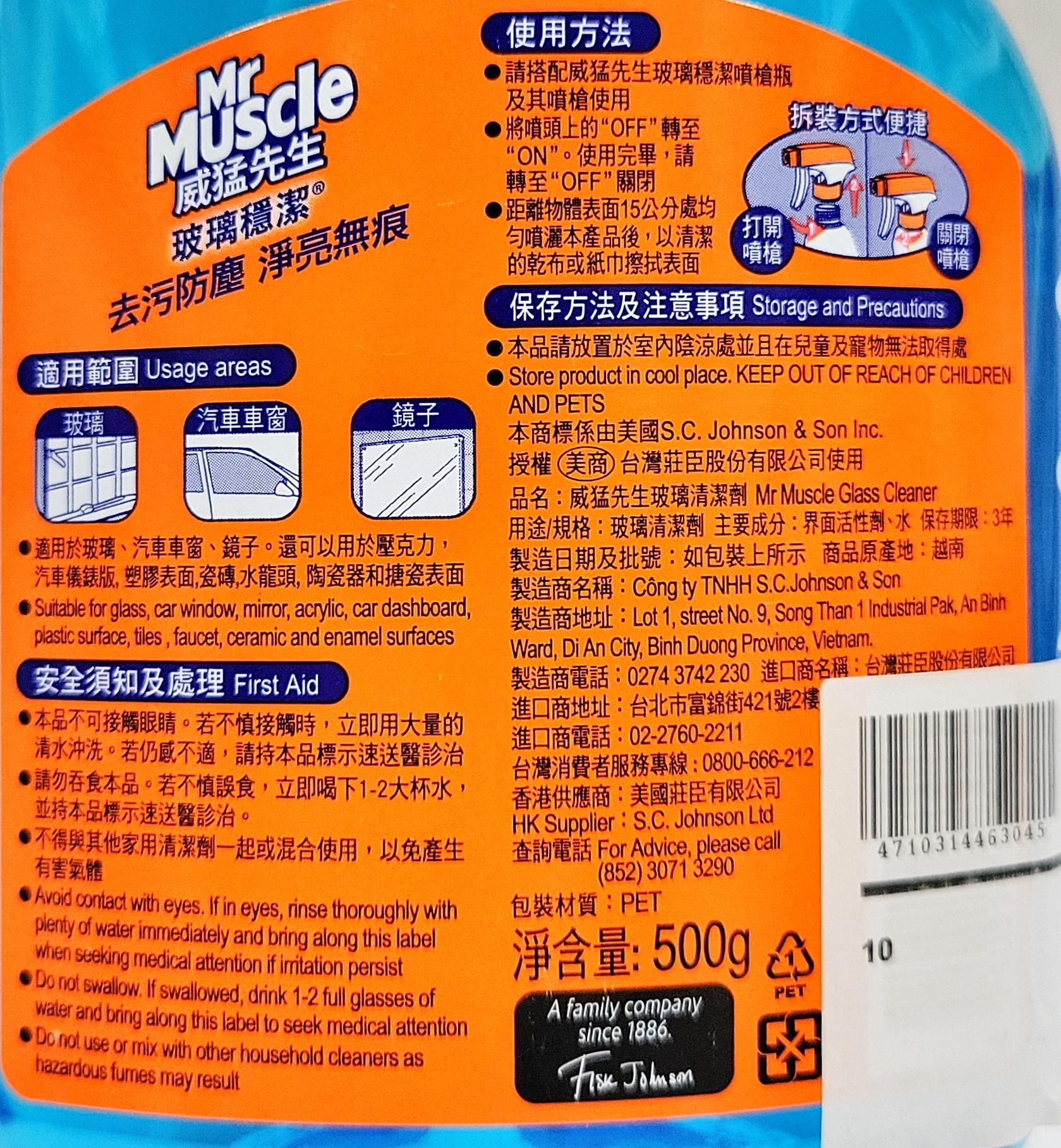 Mr Muscle 威猛先生玻璃清潔劑補充瓶,輕鬆去除玻璃表面的污垢和灰塵,讓您的窗戶、鏡子和玻璃桌面恢復閃亮光彩。其獨特配方不僅能迅速瓦解污垢,還能在玻璃表面形成保護膜,讓清潔效果更持久。適用於多種玻璃表面,包括窗戶、鏡子、汽車擋風玻璃和淋浴門等,一瓶多用,方便快捷。使用後不留水痕,讓玻璃表面晶瑩剔透,煥然一新。500g補充瓶裝,經濟實惠,是您保持家居清潔的理想選擇。