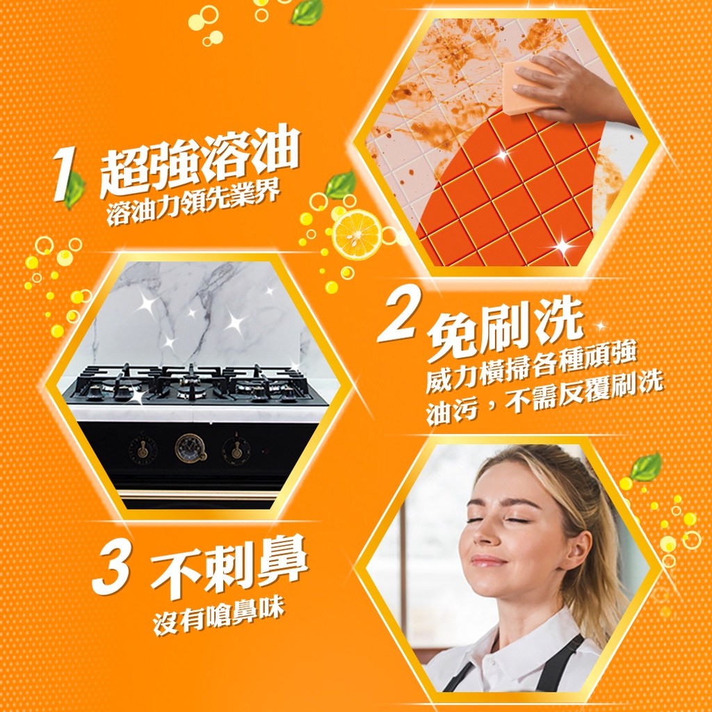 - 獨特配方能有效分解頑固油垢,無需費力刷洗,輕輕一噴一擦,廚房表面煥然一新,光亮如新。