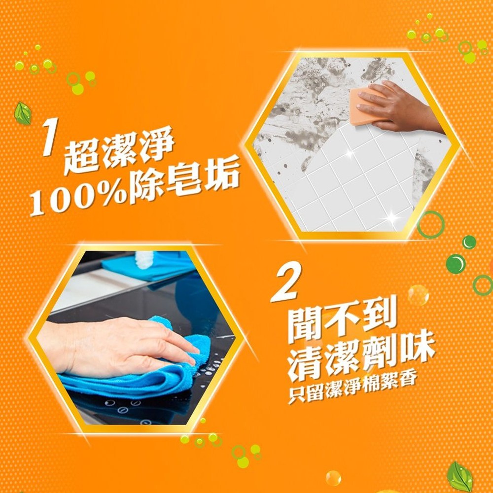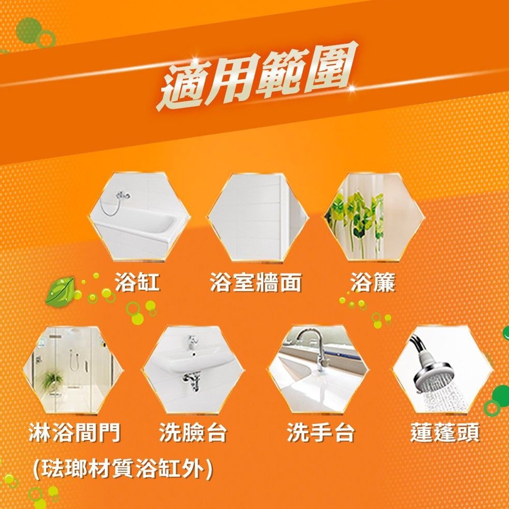 - 獨特配方能迅速瓦解浴室內的頑固水垢、皂垢與污漬,恢復磁磚、浴缸等表面的光亮潔淨。