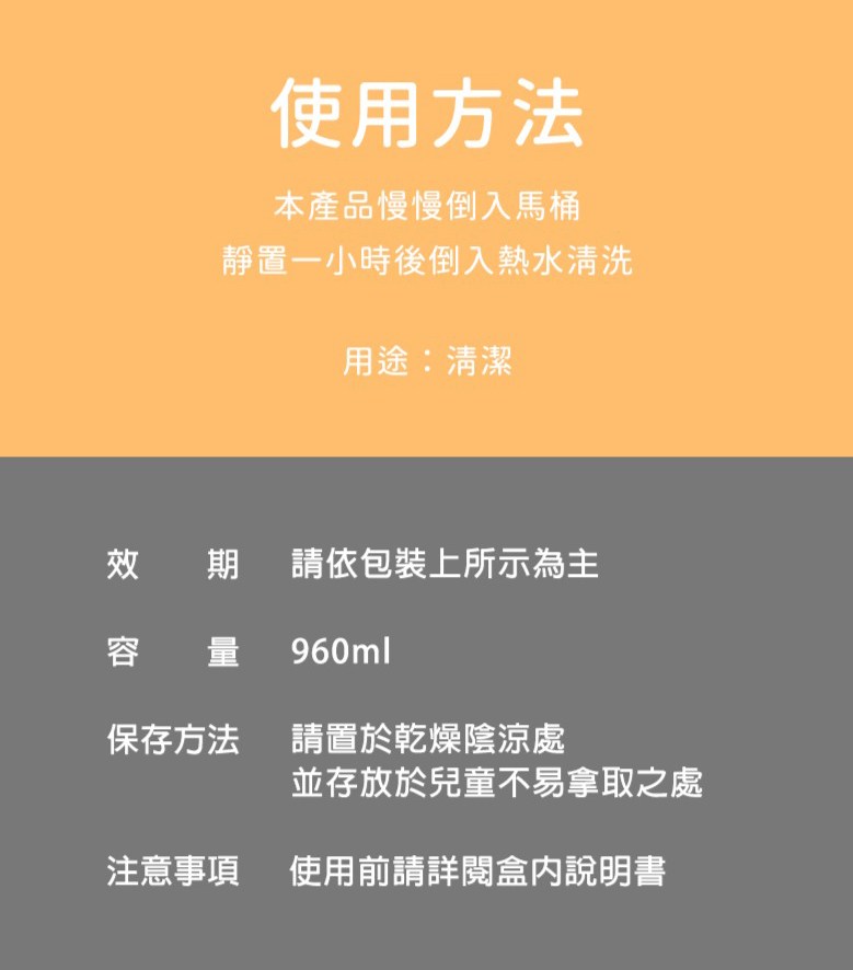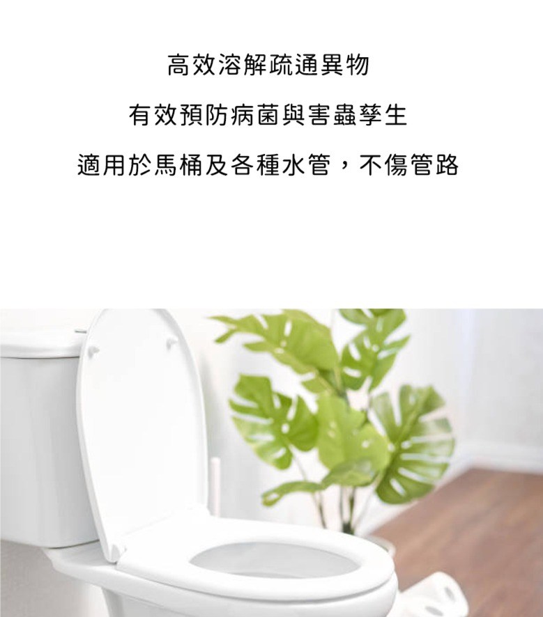 - 使用簡單方便,只需倒入靜置,輕鬆解決馬桶或排水管的堵塞問題。