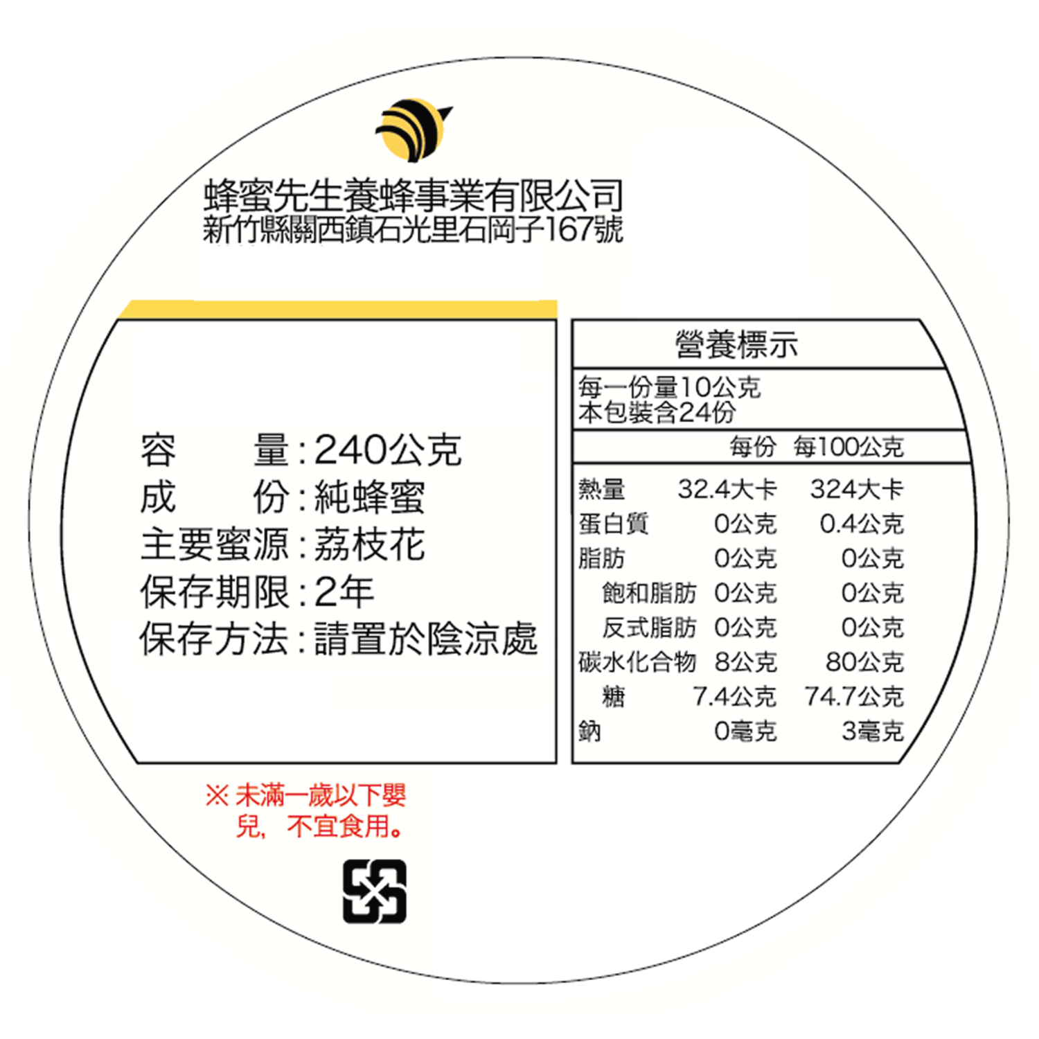 蜂蜜先生荔枝蜜,每罐240克的純荔枝蜜,帶有獨特的荔枝花香,口感清新淡雅。我們的蜂蜜由專業蜂農以超過70年的經驗,並通過SGS專業檢驗,確保每一滴蜂蜜都符合國際標準。荔枝蜜適合搭配酸性水果、果汁、飲料或烹飪食材,取代糖的使用。請置於陰涼處保存,開封後請盡快食用,未滿一歲嬰兒不宜食用。