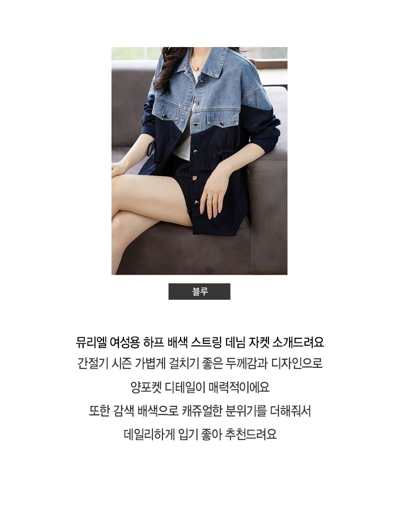 Murielle女款半拼色抽繩牛仔夾克,是換季時節的理想選擇。輕便的厚度與獨特的半拼色設計,讓您輕鬆穿出時尚感。雙口袋細節不僅實用,更增添了造型的層次感。深藍色配色營造出休閒氛圍,適合日常穿搭。這款牛仔夾克不僅舒適好穿,更能展現您的個人風格。