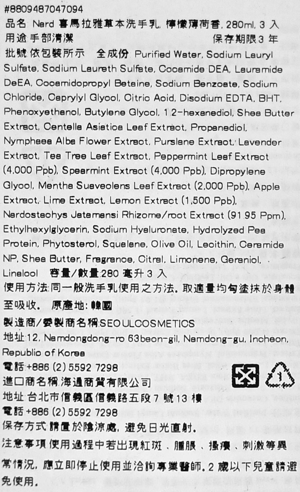 Nard 喜馬拉雅草本洗手乳,蘊含檸檬薄荷的清新香氣,為您帶來潔淨與舒爽的雙重享受。這款洗手乳採用來自喜馬拉雅山脈的珍貴草本精華,能有效去除手部污垢,同時溫和呵護肌膚,洗後不乾澀。每組包含三瓶280ml的洗手乳,適合全家使用,讓您隨時保持雙手潔淨健康,為您提供安心可靠的清潔體驗。讓Nard喜馬拉雅草本洗手乳成為您日常清潔的優質選擇,感受來自大自然的呵護。