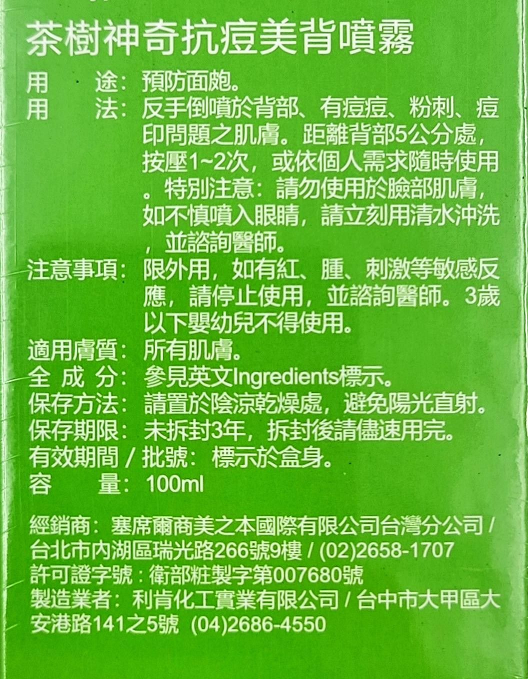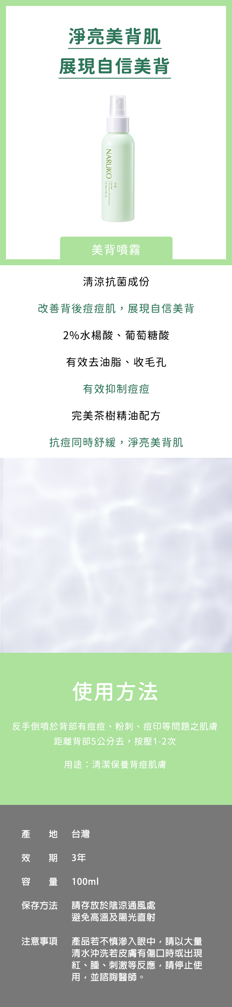 - 輕鬆噴灑於背部,告別痘痘困擾,讓肌膚清爽舒適,展現自信美背。