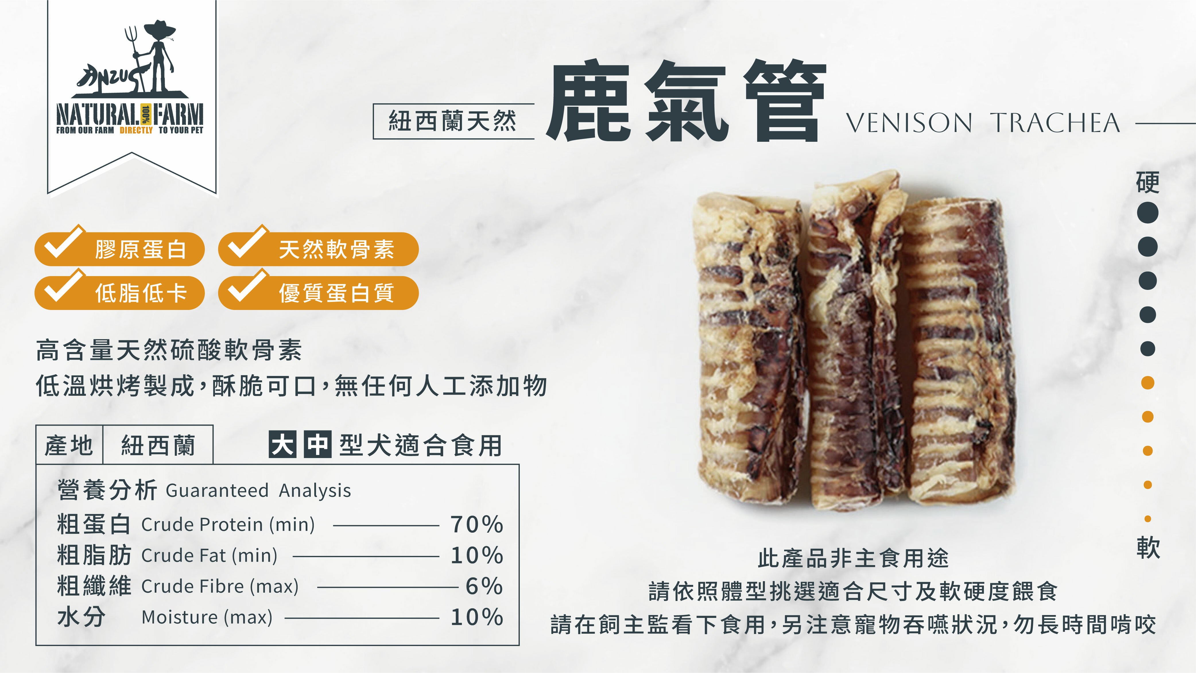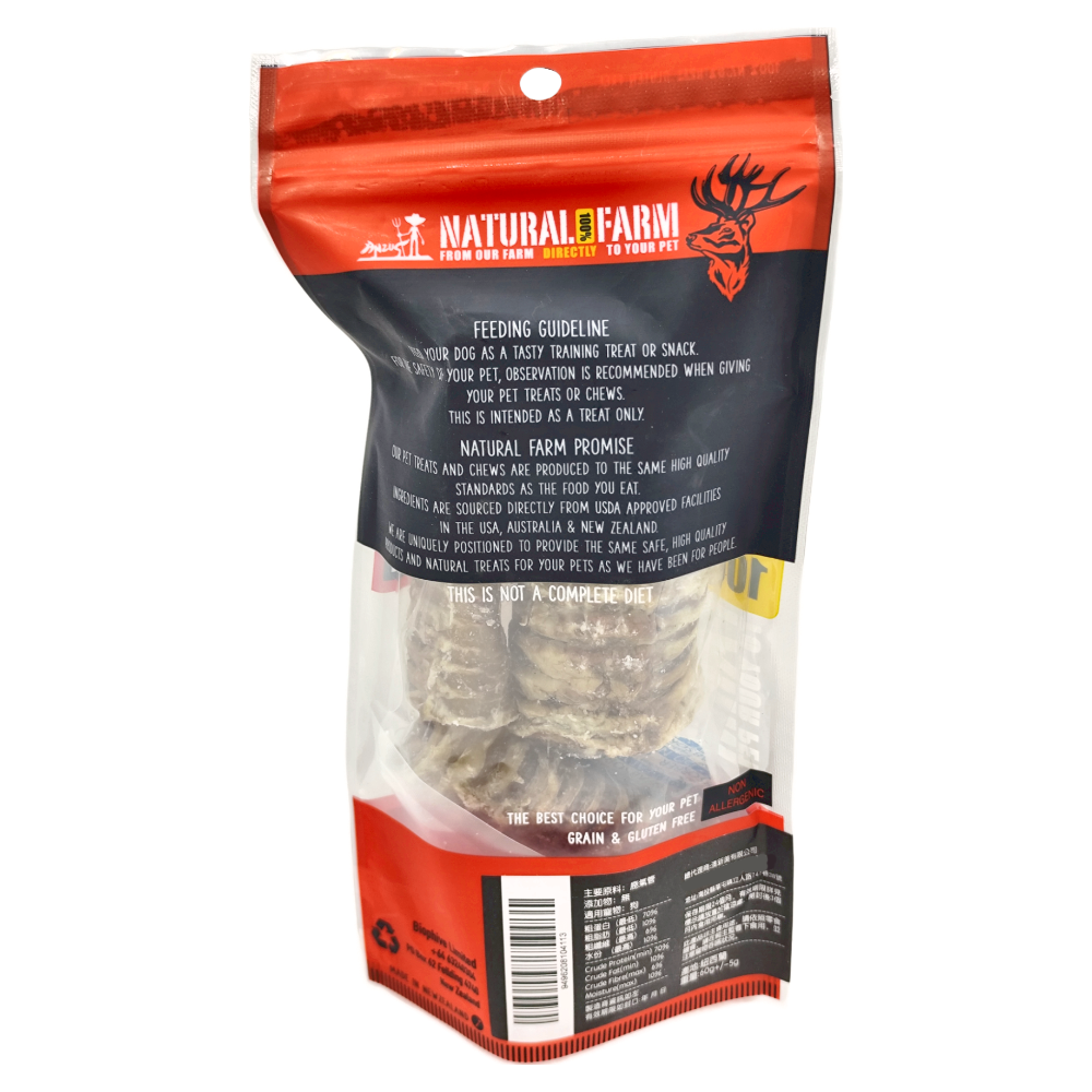 來自紐西蘭天然牧場的 NATURAL FARM 鹿氣管,是您愛犬的最佳選擇,不含任何人工色素或香料,讓您可以安心餵食,有助於維持狗狗的關節健康。不僅如此,它還是低脂低卡的健康零食,適合所有體型的狗狗。給您的愛犬一個美味又健康的享受吧!