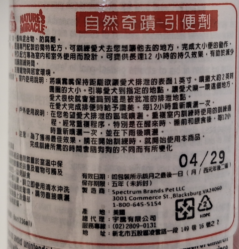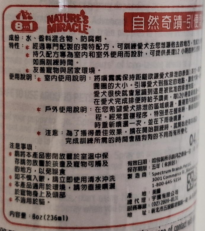 NATURE'S MIRACLE 自然奇蹟 引便劑 室內外幼犬訓練噴霧, 236ml, 1瓶