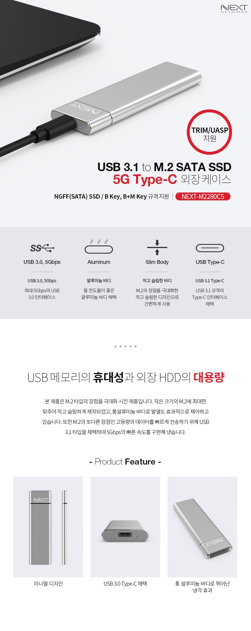 NEXT Easynet Ubiquitous USB 3.0 C轉M.2 SATA SSD外接式硬碟,採用輕巧纖薄設計,方便攜帶,讓您隨時隨地擴充儲存空間。高速USB 3.0介面提供高達5Gbps的傳輸速度,快速備份和傳輸大型檔案。全鋁合金機身不僅堅固耐用,還能有效散熱,確保SSD穩定運行。支援熱插拔和隨插即用功能,無需安裝驅動程式,連接後即可立即使用。無論是辦公、學習還是娛樂,都是您的理想選擇。本產品僅支援M.2 NGFF(SATA) B/B+M Key規格,購買前請仔細確認。