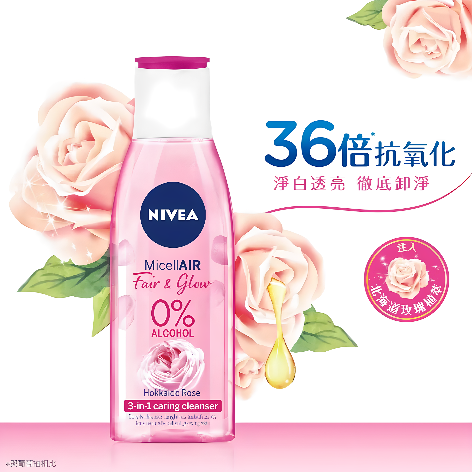NIVEA 妮維雅北海道玫瑰淨白透亮卸妝水,溫和卸除彩妝及污垢,同時提亮膚色。專為敏感肌設計,0%酒精配方,不刺激肌膚。蘊含北海道玫瑰精華,有效抗氧化,使肌膚淨白透亮。200ml容量,方便攜帶,隨時隨地保持肌膚清潔。使用後肌膚清爽不緊繃,散發自然玫瑰香氣。
