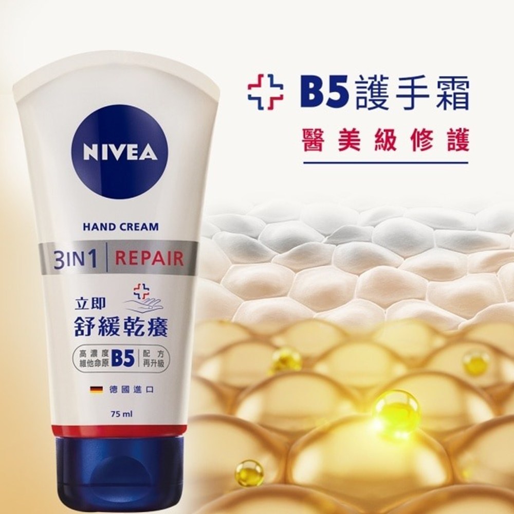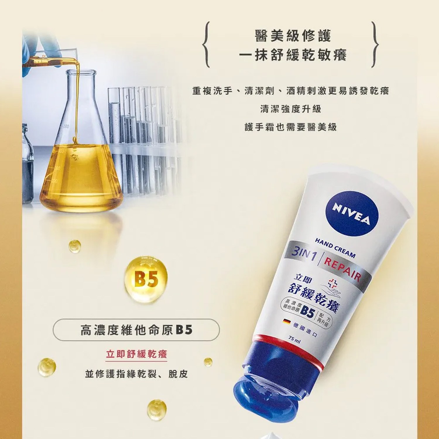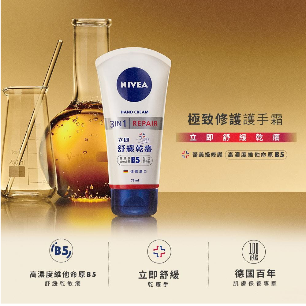 妮維雅極致修護護手霜,為您帶來醫美級的呵護體驗。這款護手霜富含高濃度維他命原B5,能迅速舒緩乾燥,深層修護手部肌膚,特別針對指緣乾裂、脫皮等問題,提供溫柔呵護。德國進口配方,品質保證,讓您在重複洗手、接觸清潔劑或酒精後,依然能保持雙手柔嫩光滑。75ml的容量,方便攜帶,隨時隨地呵護您的雙手,告別乾燥敏感,重現健康光采。選擇妮維雅,給您的雙手最極致的修護。