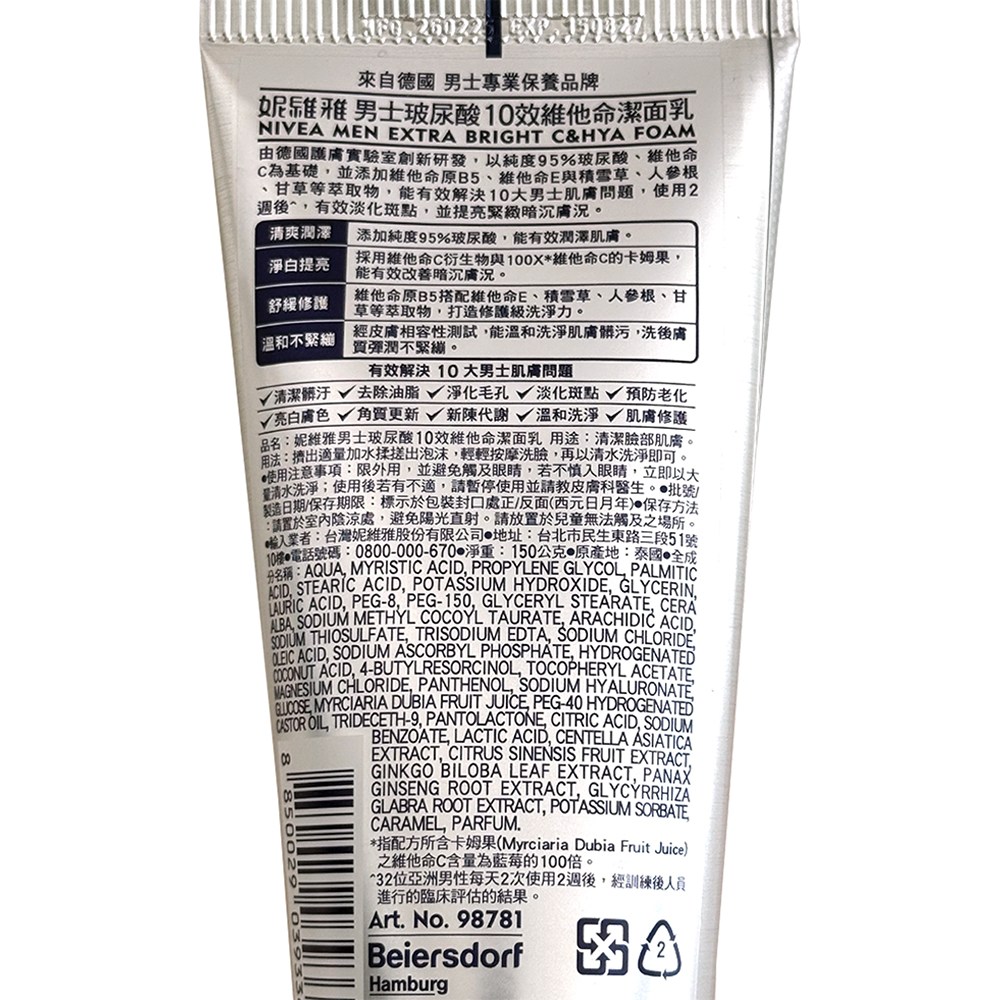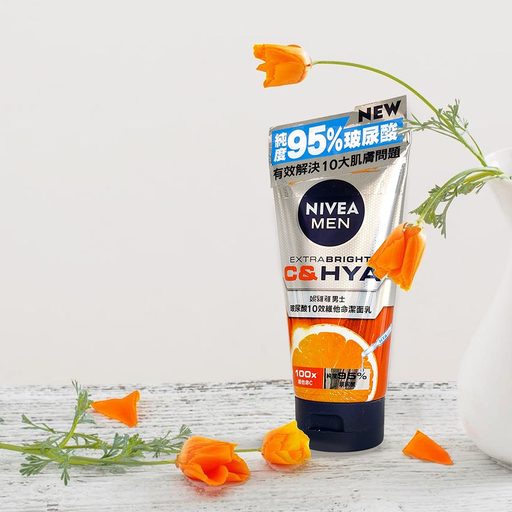 NIVEA 妮維雅男士玻尿酸10效維他命潔面乳,專為男士肌膚設計,能有效清潔毛孔髒污及多餘油脂,同時深層滋潤肌膚。其獨特配方富含玻尿酸及多種維他命,洗後肌膚不緊繃,保持清爽舒適。每日使用,能提升肌膚保水度,改善乾燥粗糙,使肌膚柔嫩光滑,展現健康光澤。讓您輕鬆擁有潔淨、清爽、健康的男士肌膚。