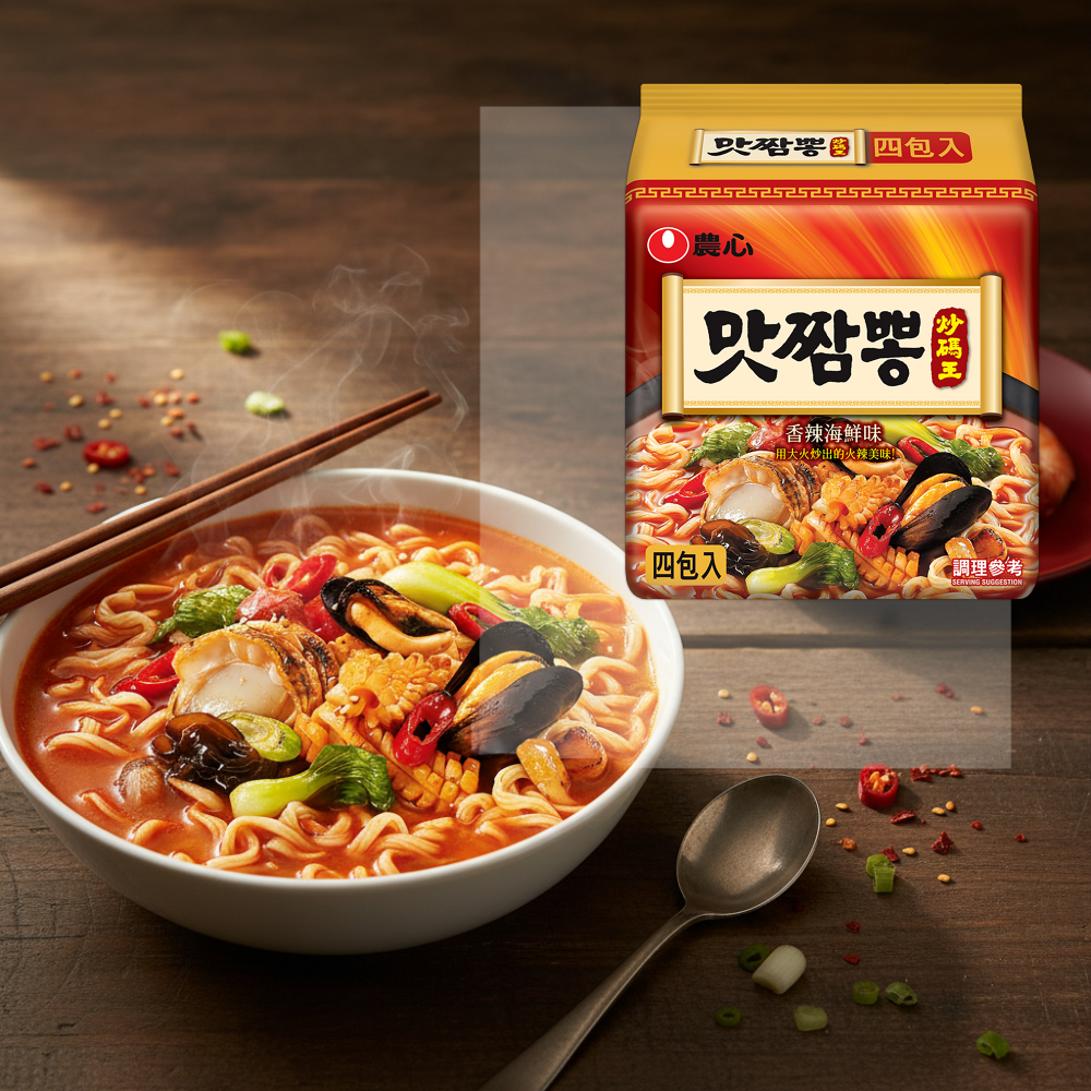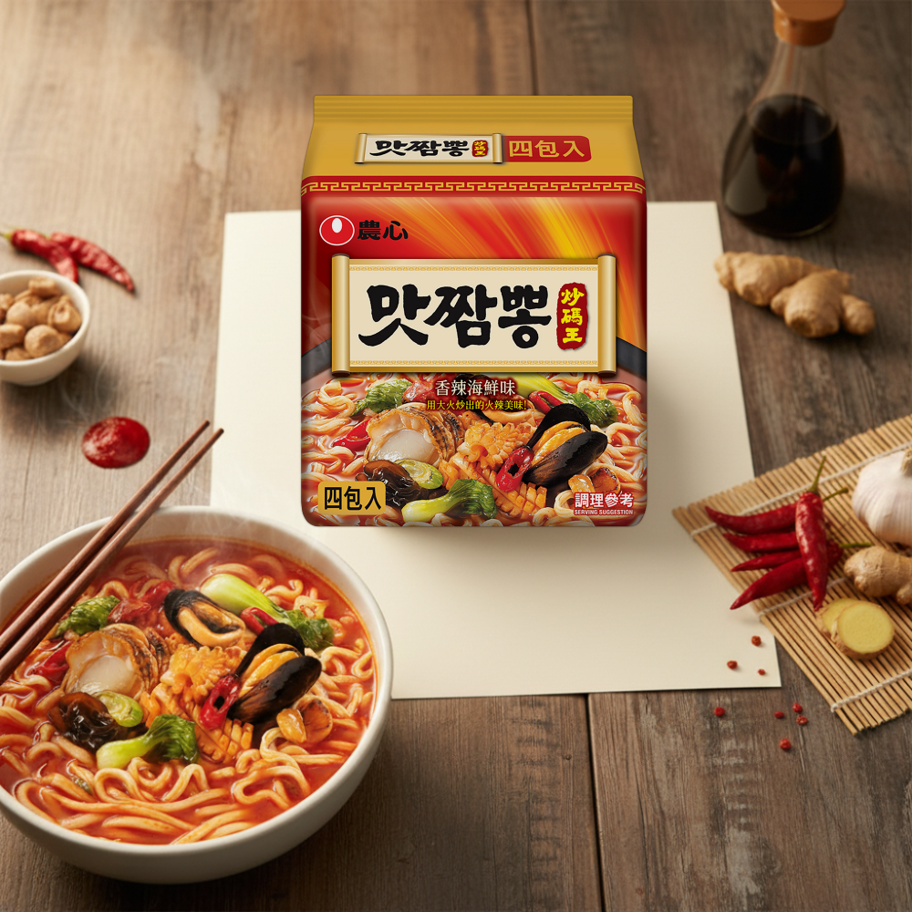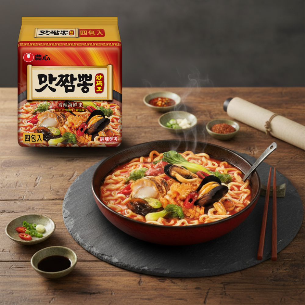 - 農心炒碼麵,湯頭濃郁海鮮風味,口感豐富有層次,讓您在家也能輕鬆享受道地韓式美味。