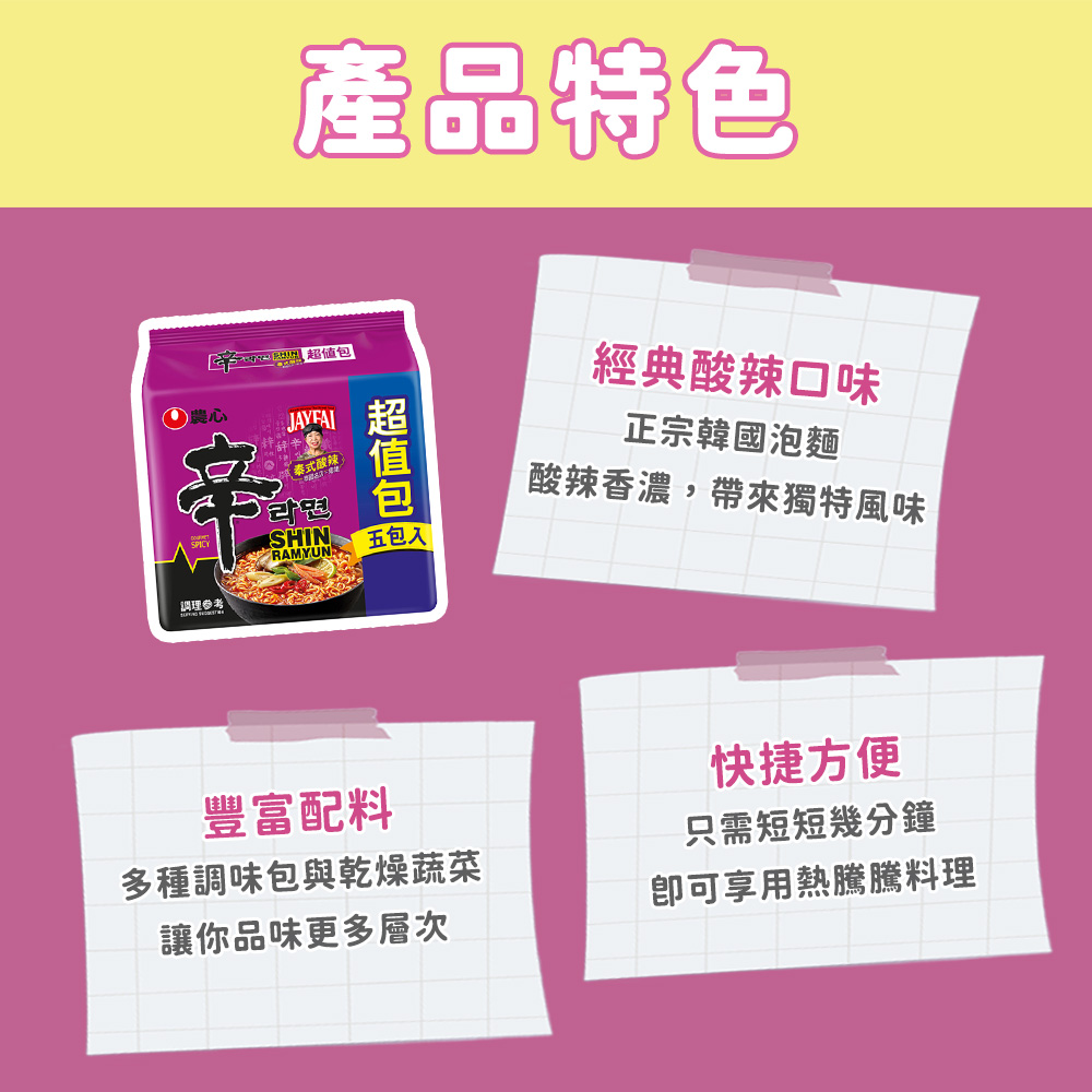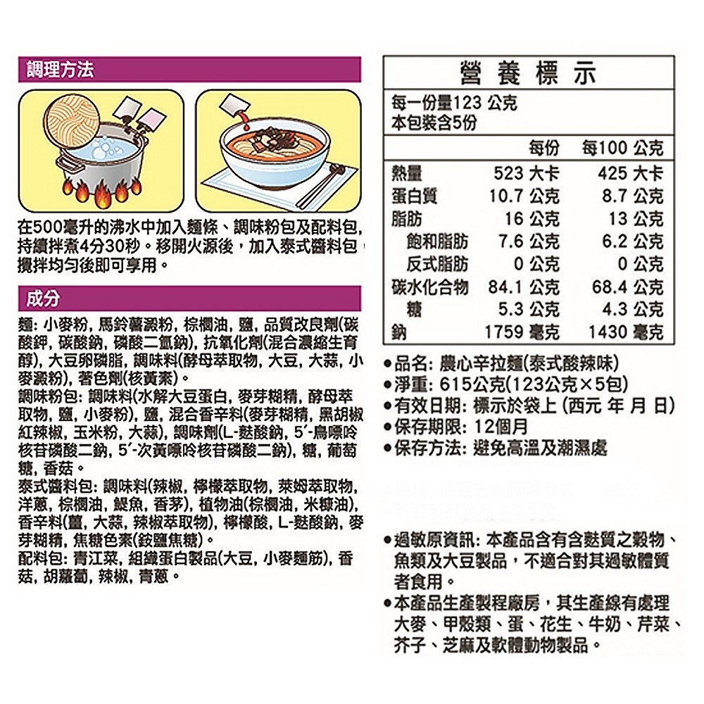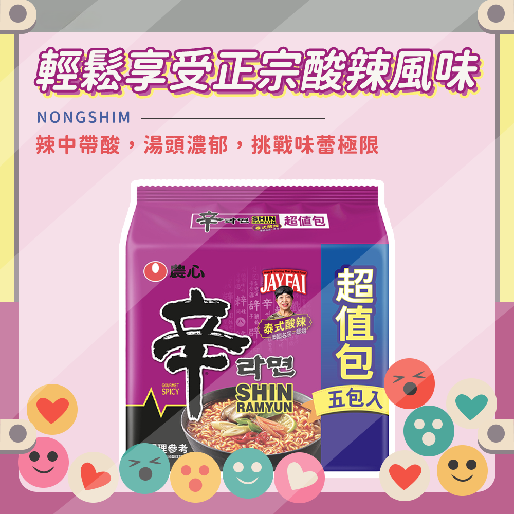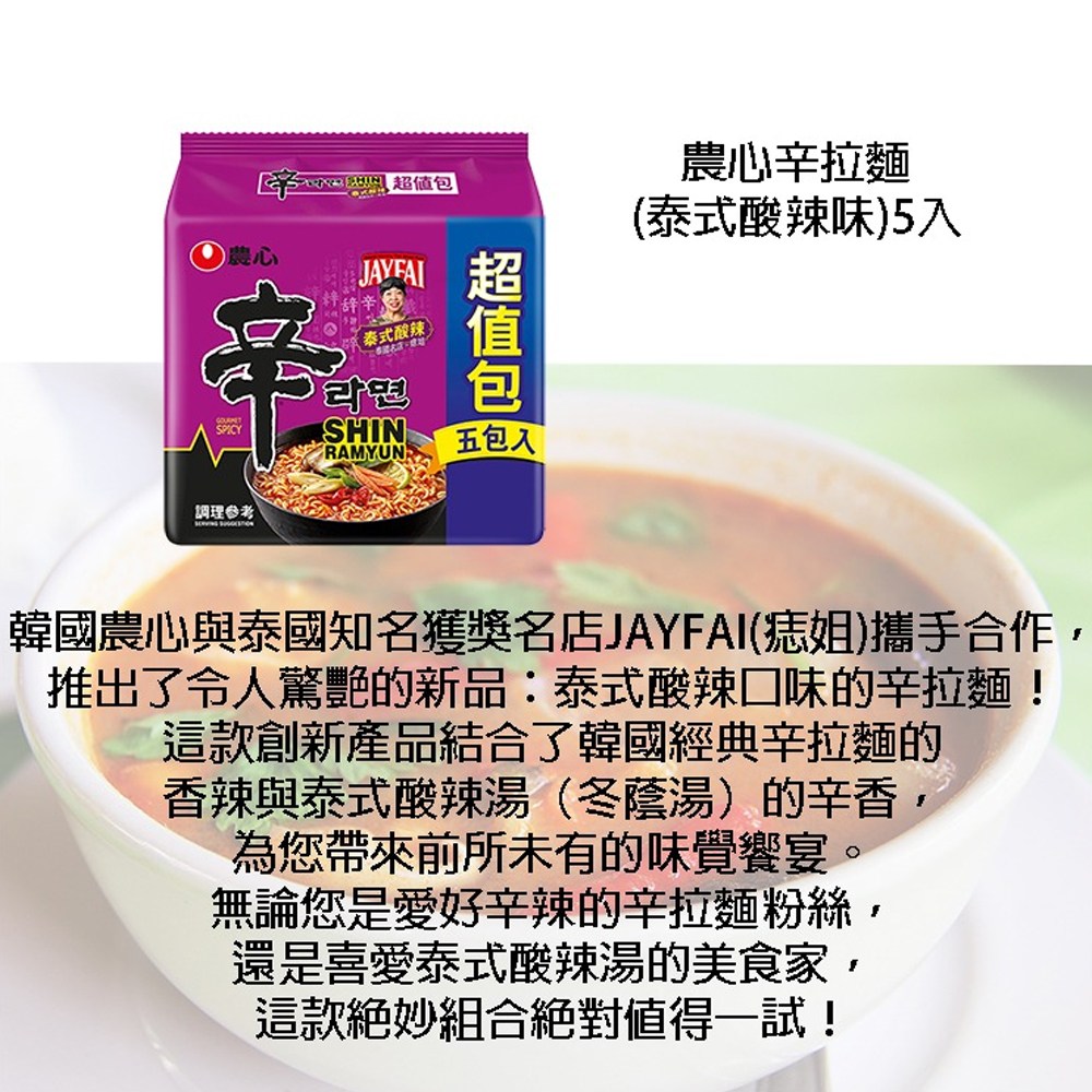 - 農心辛拉麵泰式酸辣味,湯頭濃郁,酸辣夠味,讓您一口接一口,享受道地泰式風味。
