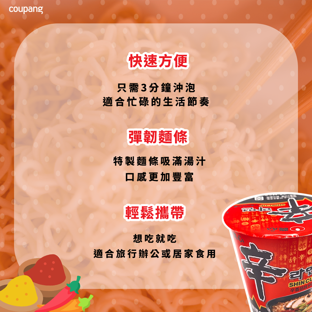 - 杯麵設計輕巧方便,隨時隨地享受美味,無論辦公室或戶外都適合。