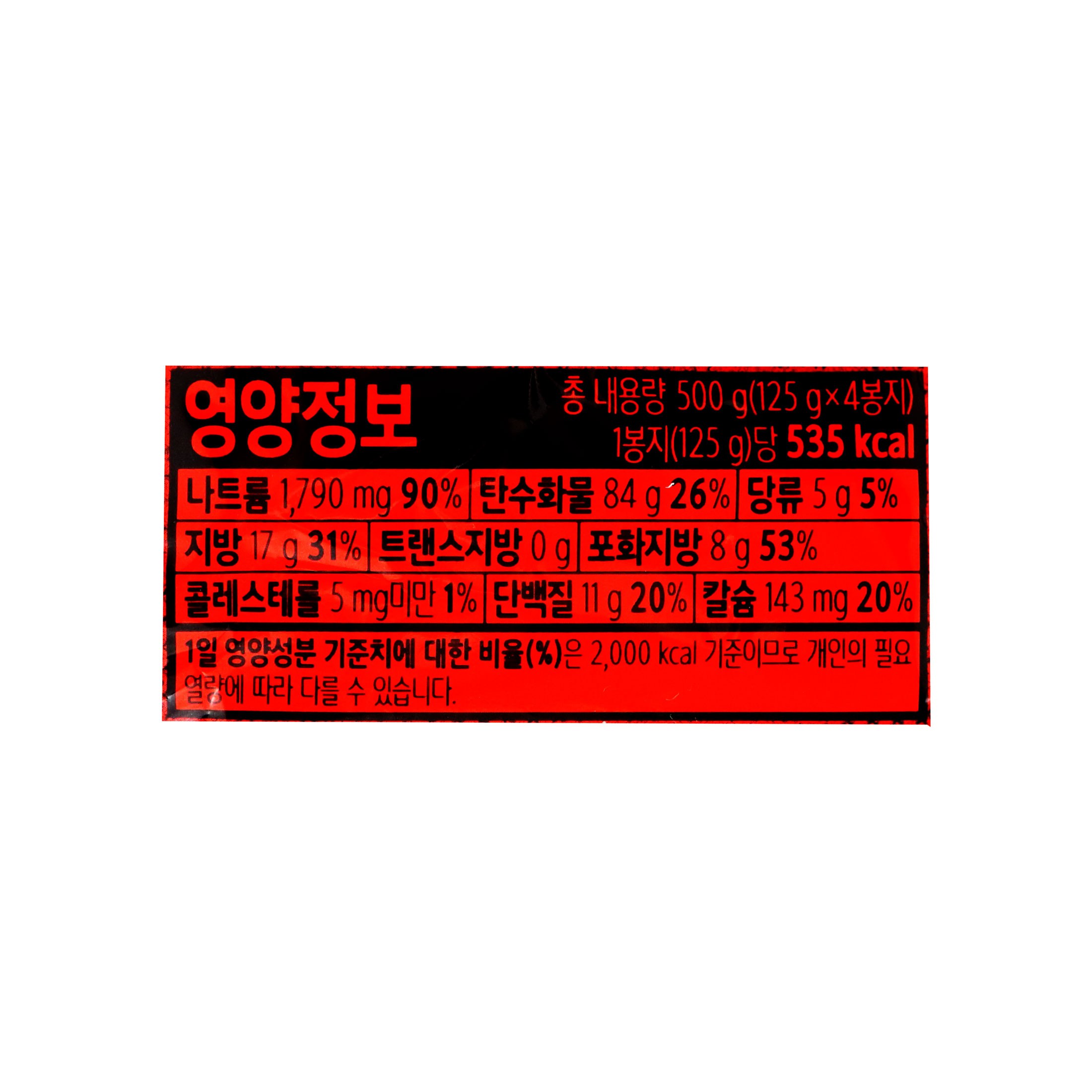 成分:麵體:小麥粉(麥)、馬鈴薯澱粉、棕櫚油、化製澱粉、蛋殼粉、精鹽、蔬菜調味萃取物、品質改良劑(酸度調節劑)、複方添加劑(酸度調節劑)、寡糖綠茶風味液、維生素B2 .湯包:牛肉味基底、精鹽、葡萄糖、辣味醬料粉、辣椒味風味粉、醬油醬料粉、辣椒粉、醬油粉、胡椒粉、炒醬料粉、調味混合醬油粉、青陽辣椒粉、調味牛肉粉、精製麥芽糖、調味醬料粉、大蒜基底、辣味粉、辣味調味粉、5'-核糖核苷酸二鈉、調味紅辣椒粉、精製白糖、香菇萃取物粉、凍乾蒜粉、琥珀酸二鈉、大蒜萃取物粉、洋蔥風味粉、植物性蛋白、乾燥香菇、乾燥青江菜、辣椒味配菜、乾燥蛋絲W、乾燥蛋絲Y、乾燥蔥