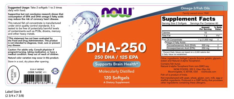 - 每顆NOW Foods DHA-250軟膠囊含有豐富DHA和EPA,有助於促進健康,讓您充滿活力。