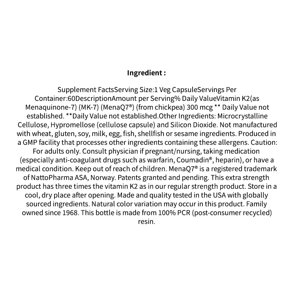 - 每份膠囊提供300mcg的MK-7,有助於骨骼健康,提升生活品質。