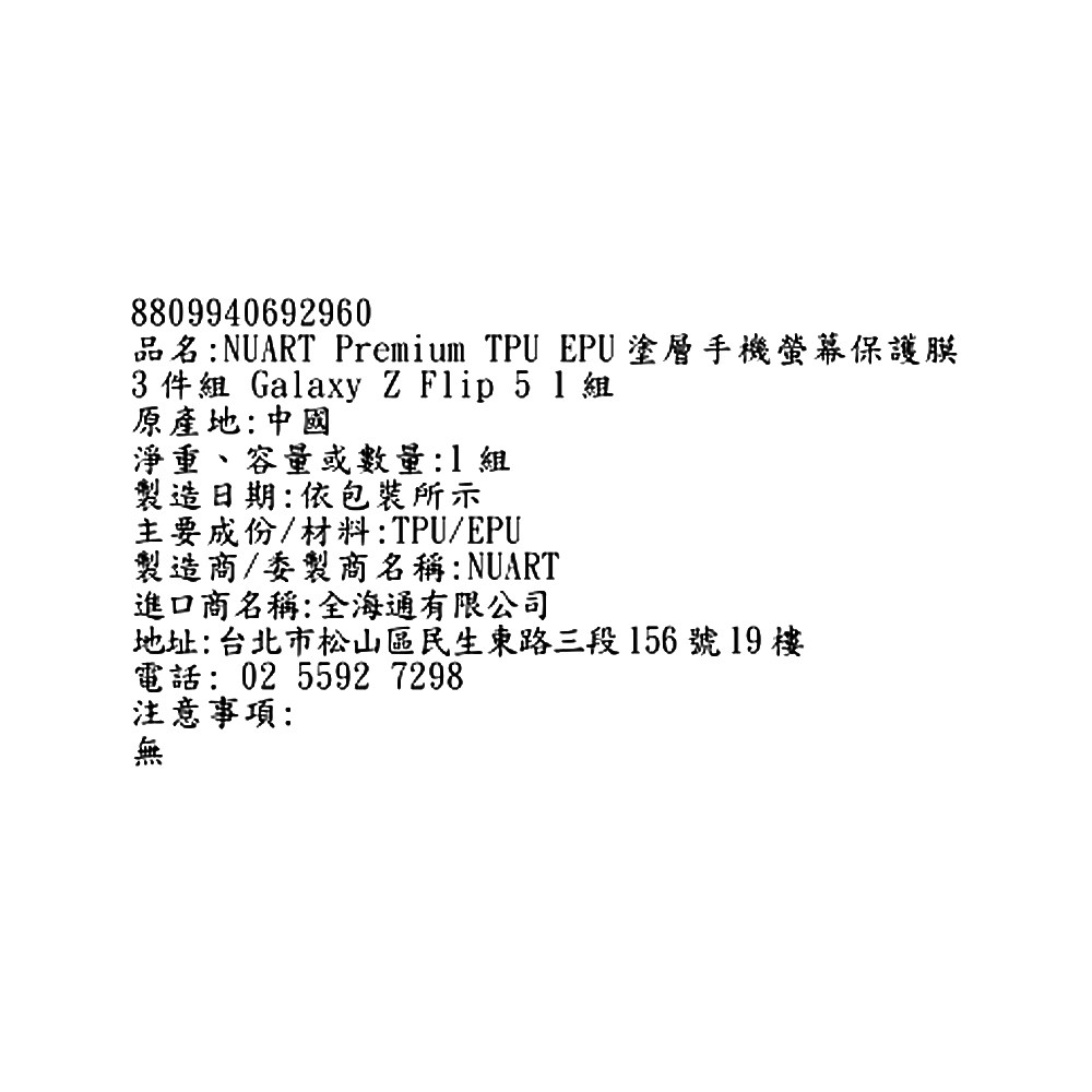 NUART Premium TPU EPU塗層手機螢幕保護膜,專為Galaxy Z Flip 5量身打造。採用頂級TPU材質,不僅觸感柔滑,保持螢幕的清晰透亮。超薄設計完美貼合螢幕,不影響手機的摺疊使用,維持手機輕巧便攜的優勢。高透光材質確保視覺效果清晰,色彩鮮豔不失真,讓您享受最佳的使用體驗。三件組的設計經濟實惠,方便隨時更換,確保您的螢幕持久如新。