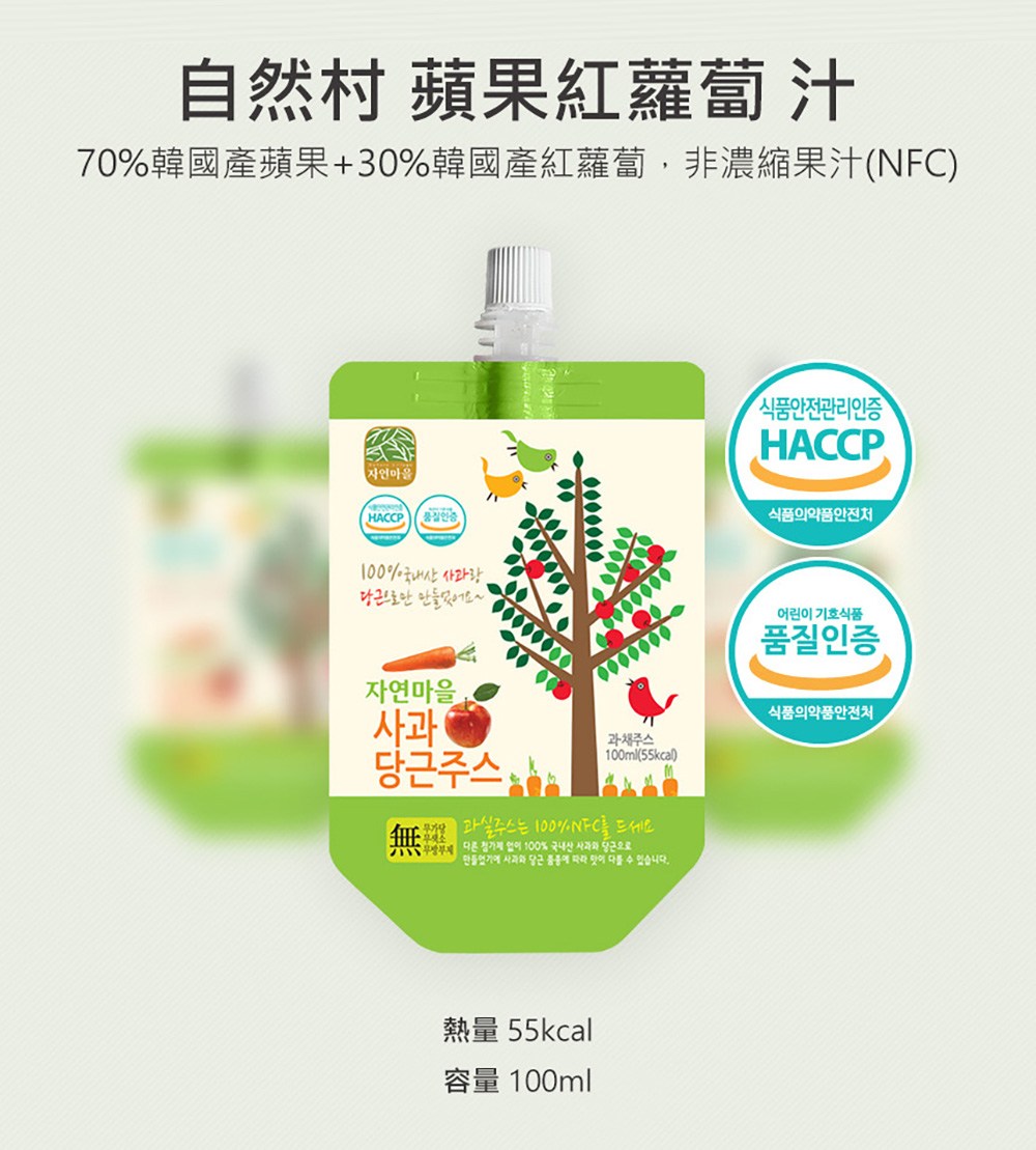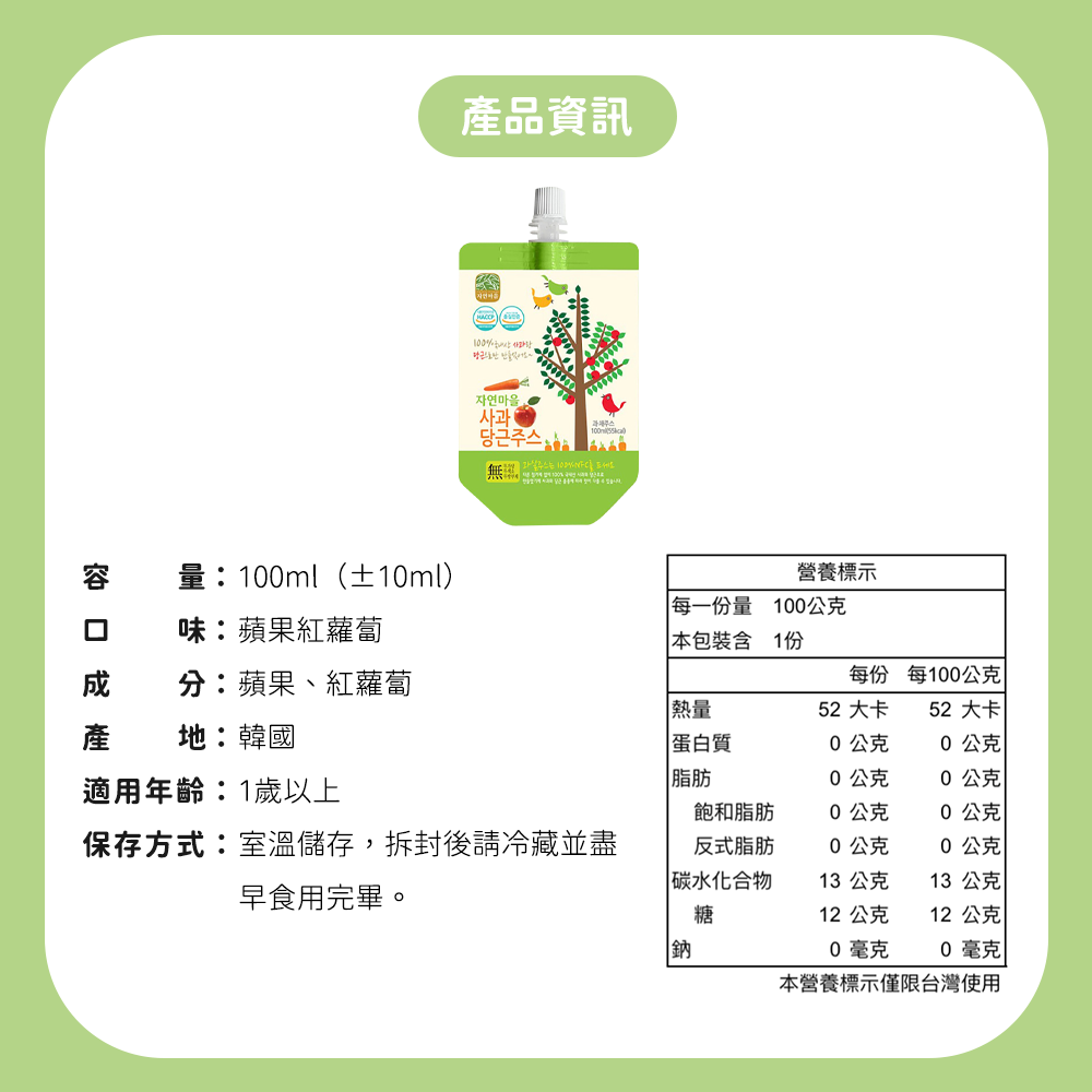 - 採用韓國產蘋果與紅蘿蔔,口感香甜,讓寶寶愛不釋手,隨時補充活力,健康成長每一天。