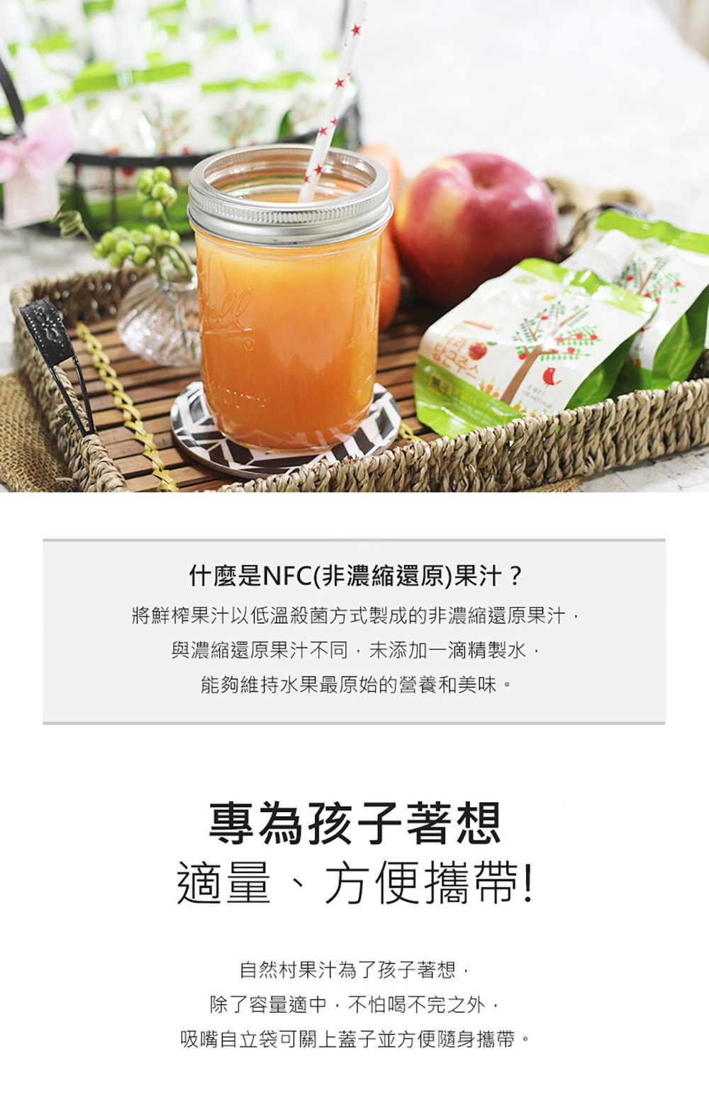 Nature Village 自然村 蘋果紅蘿蔔果汁,是專為一歲以上寶寶設計的健康飲品。這款果汁採用70%韓國產蘋果和30%韓國產紅蘿蔔。採用非濃縮果汁(NFC)技術,完整保留水果的原汁原味,不添加任何人工色素或防腐劑,讓寶寶喝得安心。每包含有100毫升的果汁,方便攜帶和飲用,是寶寶外出或在家時的理想選擇。經過HACCP食品安全認證,確保產品的品質和安全,讓父母放心給寶寶食用。