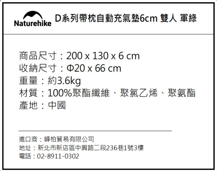 Naturehike D系列帶枕自動充氣墊,是您戶外露營的理想選擇。這款雙人充氣墊採用軍綠色設計,厚度達6公分,提供舒適的睡眠體驗。其自充氣泡棉核心結構,讓您輕鬆完成設置,無需額外工具。聚酯纖維材質輕便耐用,方便攜帶。無論是露營愛好者還是追求舒適睡眠的旅行者,這款充氣墊都能滿足您的需求。