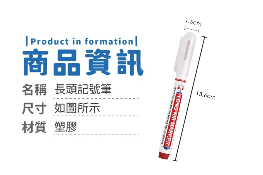 NeW 新年推出22mm長頭記號筆,G709型號,每盒20支紅色筆,是您手工藝和維修的理想選擇。這款長頭記號筆採用耐用的塑料材質,筆身設計符合人體工學,握感舒適,即使長時間使用也不易疲勞。長筆頭設計讓您輕鬆觸及狹窄或深孔位置,精準標記,適用於各種手工藝品製作、零件維修等場景。紅色墨水色彩鮮明,持久不褪色,確保您的作品清晰可見。無論是專業工匠還是手工愛好者,這款記號筆都能滿足您的需求,讓您的創作更加精準高效。