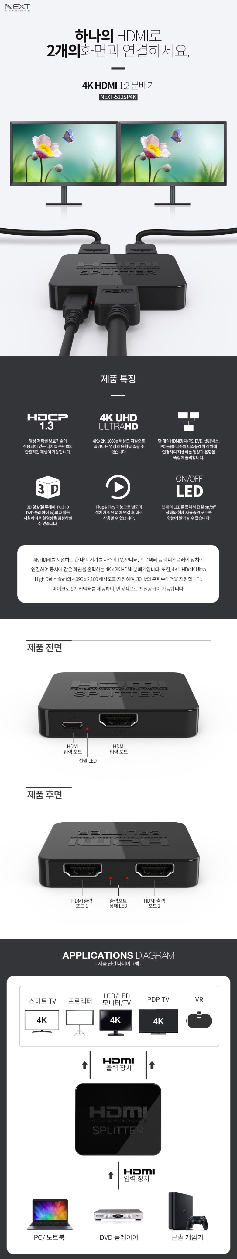 NEXT 1對2 HDMI分配器讓您輕鬆將一個HDMI訊號源同步輸出到兩個顯示裝置,無需頻繁更換連接線。支援4K超高解析度,提供清晰細膩的影像品質,無論是觀看電影、玩遊戲或進行簡報,都能享受更佳的視覺體驗。隨插即用的便利設計,省去了繁瑣的設定步驟,連接後即可立即使用。產品配備LED指示燈,方便您隨時掌握連接狀態。適用於家庭娛樂、辦公室會議、教學演示等多種場合。