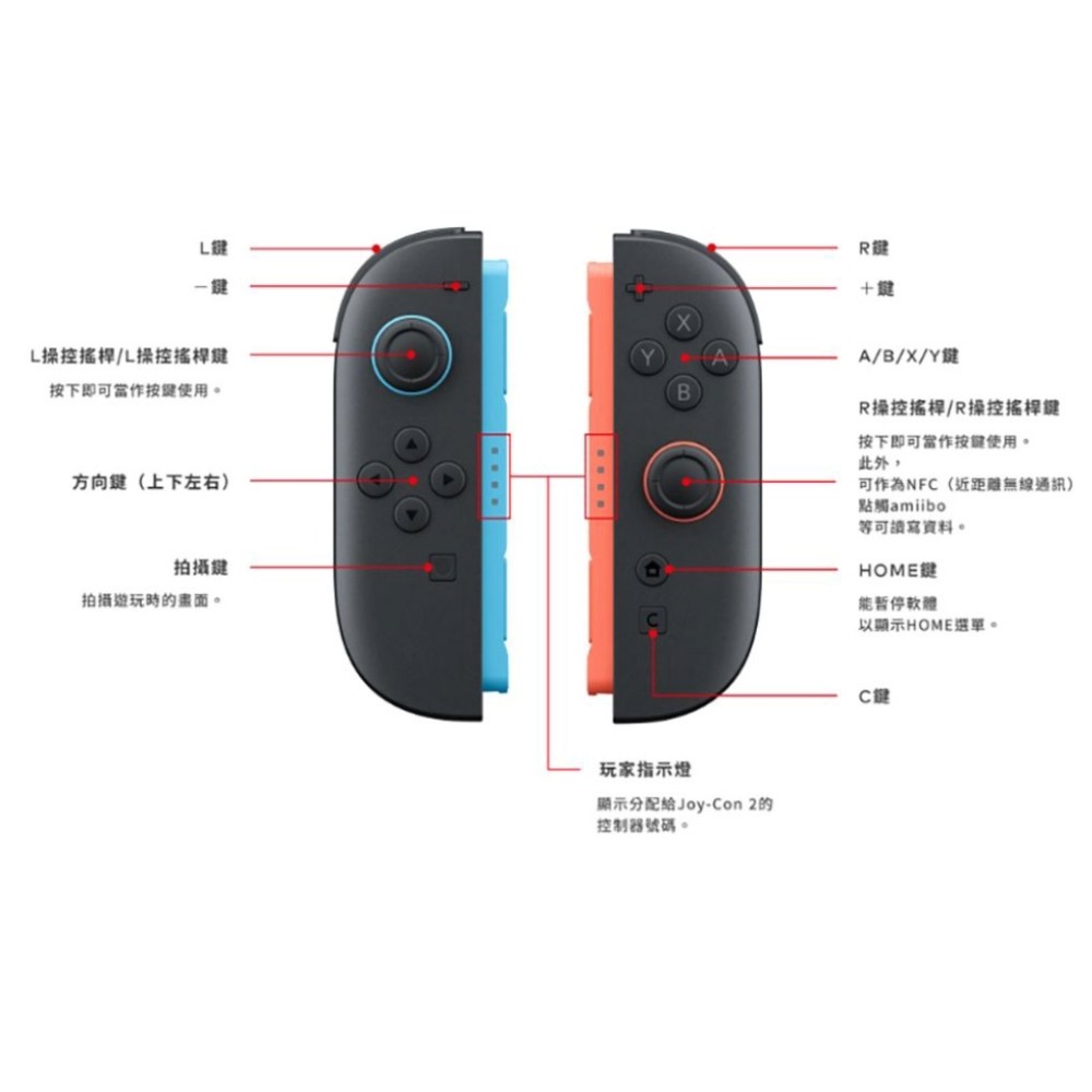 Nintendo Switch Joy-Con 左右手控制器,為您的遊戲體驗帶來更多樂趣。這款控制器採用黑藍色與黑紅色搭配,外型時尚獨特。具備多種按鍵功能,包含L操控搖桿、方向鍵、攝影鍵、HOME鍵等,操作靈敏便捷。內建動作感應器與陀螺儀感應器,提供更真實的遊戲互動。此外,HD震動功能讓您感受更細膩的震動回饋,提升遊戲沉浸感。