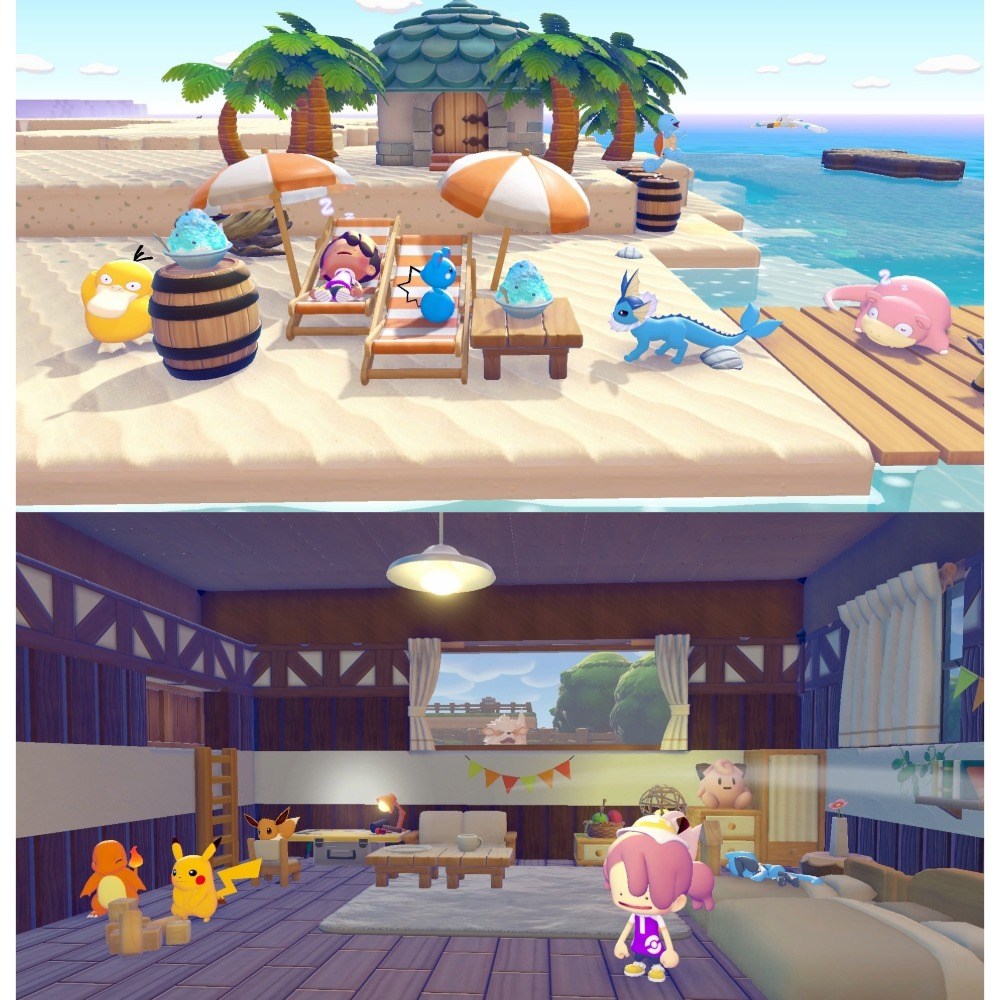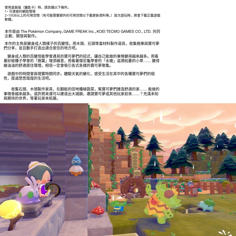- 在廣闊的地圖上,建造舒適家園與聚落,享受與寶可夢們共同生活的悠閒時光。