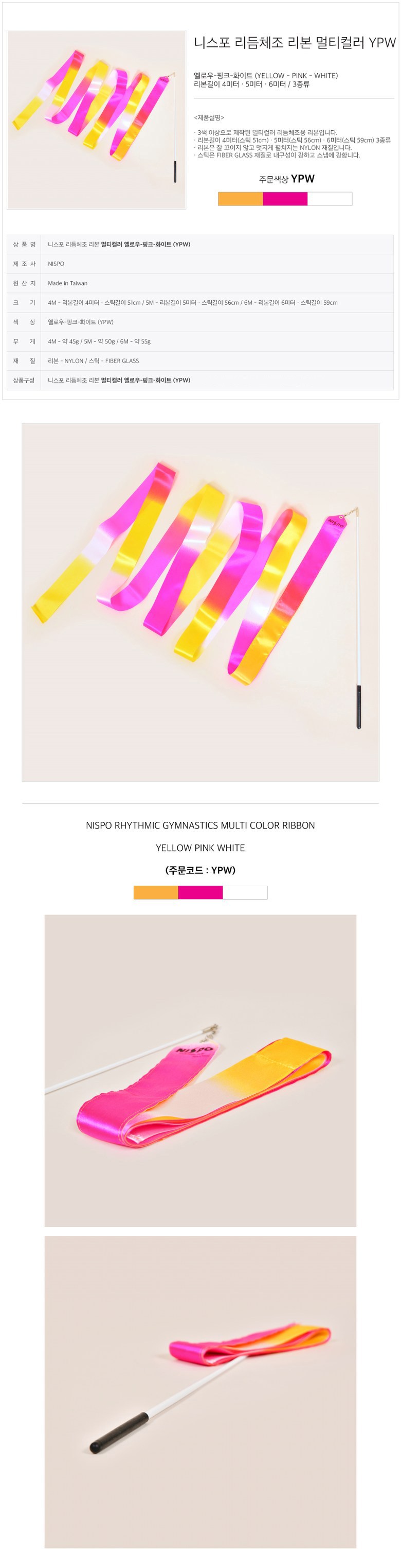 Nispo 藝術體操絲帶多色絲帶長度 4M, 黃色/粉色/白色