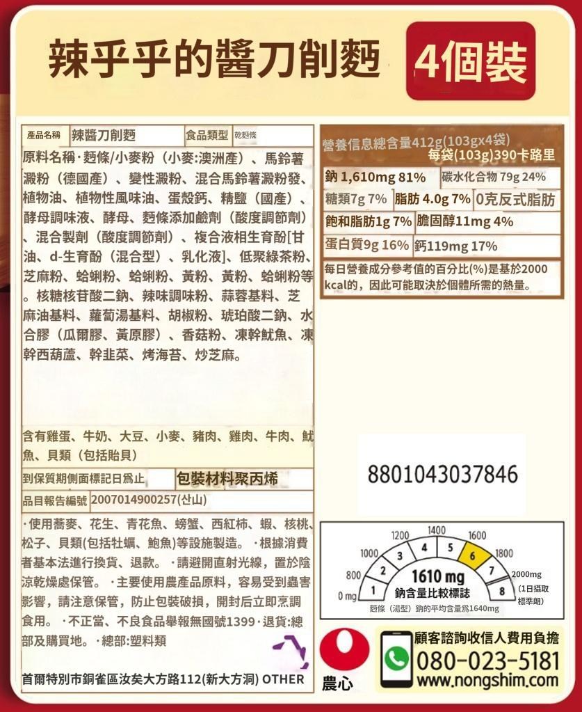 - 農心香辣刀削麵,Q彈有勁,搭配濃郁夠味的香辣醬汁,讓您在家也能輕鬆享受道地韓式風味。