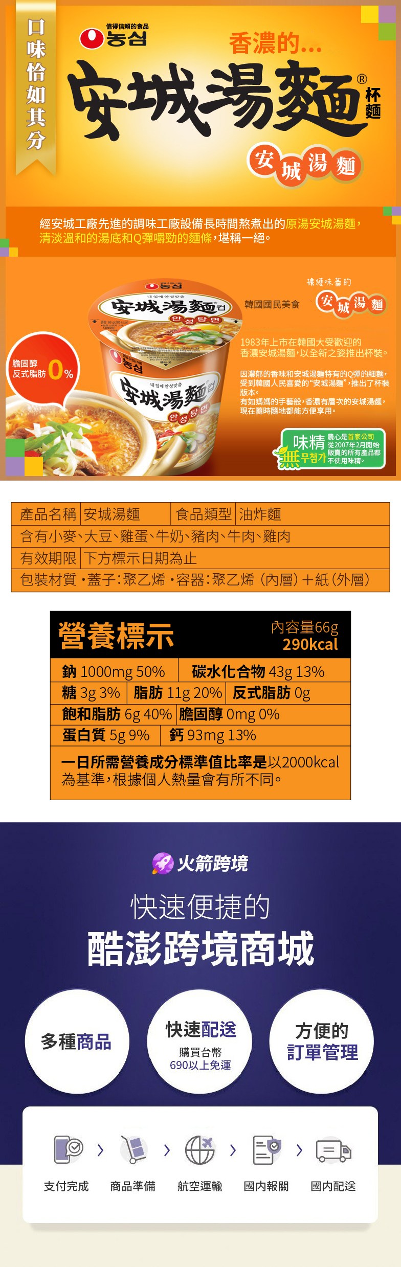 農心安城湯麵杯麵,是韓國人氣不敗的經典美味。湯頭以獨家配方熬製,香濃夠味,搭配Q彈有勁的麵條,每一口都是享受。杯裝設計輕巧方便,無論在家或辦公室,隨時都能輕鬆享用道地的韓國拉麵。不含味精,讓您吃得安心又健康。快來體驗安城湯麵帶來的幸福滋味吧!