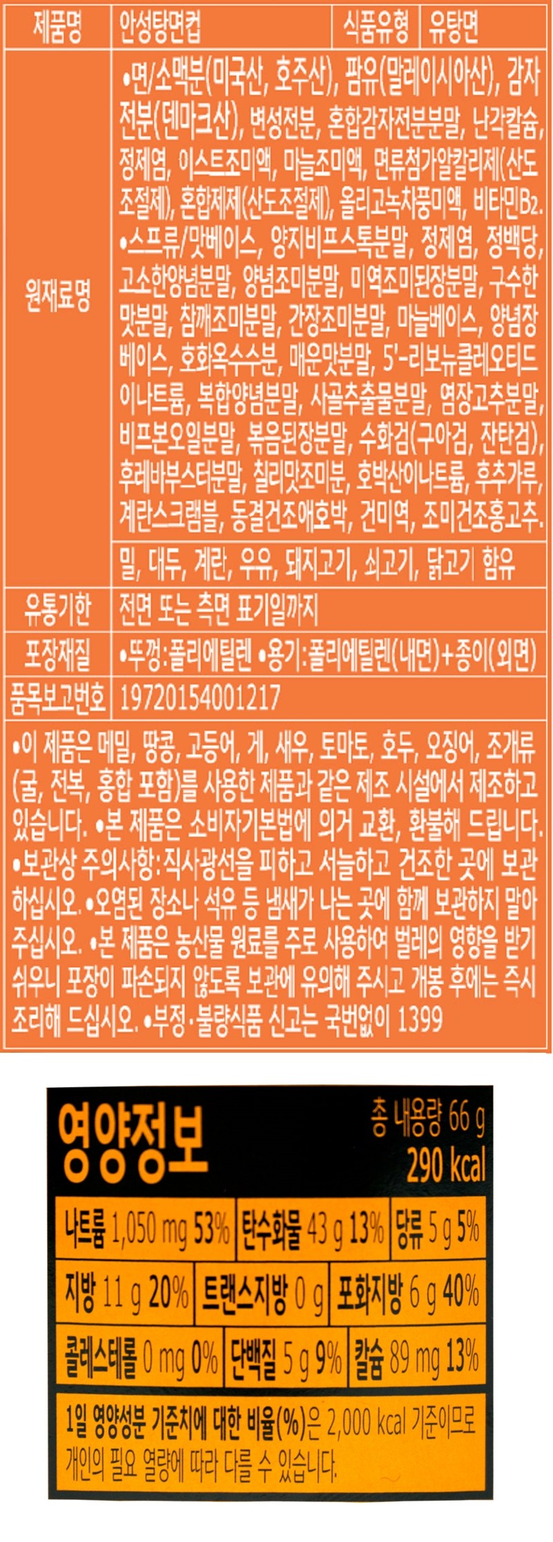 成分: 麵體:小麥粉(小麥)、棕櫚油、馬鈴薯澱粉、化製澱粉、蛋殼鈣、精鹽、大蒜調味液、品質改良劑(酸度調節劑)、複方添加劑(酸度調節劑)、寡糖綠茶風味液、維生素B2/湯包:調味基底粉、牛肉高湯粉、精鹽、砂糖、鮮味醬料粉、醬料調味粉、海帶調味大醬粉、鮮味粉、芝麻調味粉、醬油調味粉、大蒜基底粉、調味醬基底、糊化玉米粉、辣味粉、5′-核糖核苷酸二鈉、複合醬料粉、牛骨萃取粉、鹽漬辣椒粉、牛骨油粉、炒大醬粉、增稠劑(關華豆膠、玉米糖膠)、增味粉、辣味調味粉、琥珀酸二鈉、胡椒粉、乾燥雞蛋塊、凍結乾燥櫛瓜、乾燥海帶、調味乾燥紅辣椒