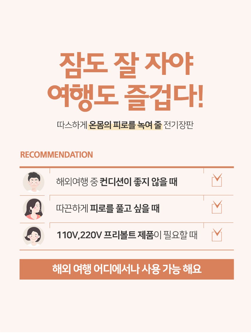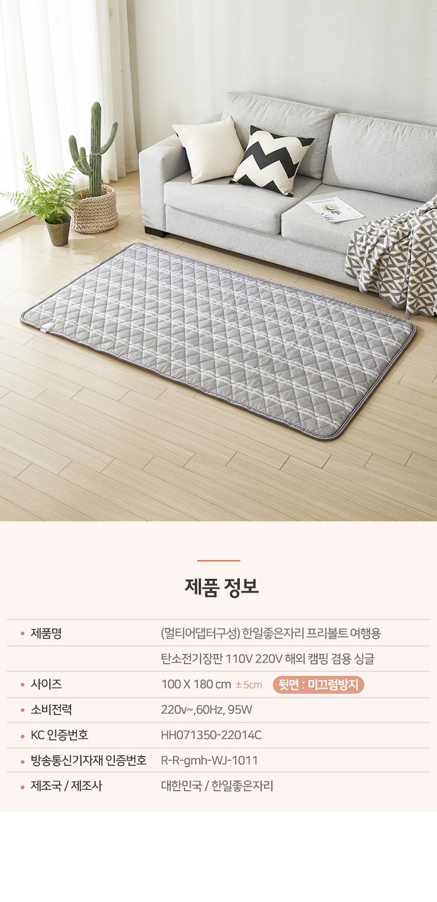 Noopza Hanil Joeunjari 國際電壓旅行用碳素電熱毯組,是您旅行中的最佳夥伴。輕巧的設計方便攜帶,讓您隨時隨地都能享受溫暖。採用碳素纖維加熱技術,快速且均勻地提供舒適的熱度,有效舒緩疲勞。搭配多功能轉接頭,適用於110V和220V電壓,讓您在世界各地都能使用。無論是露營還是海外旅行,這款電熱毯都能為您帶來溫暖舒適的睡眠體驗。