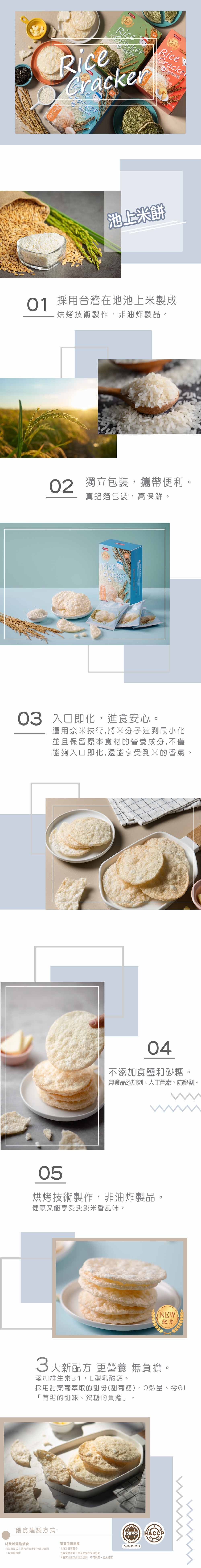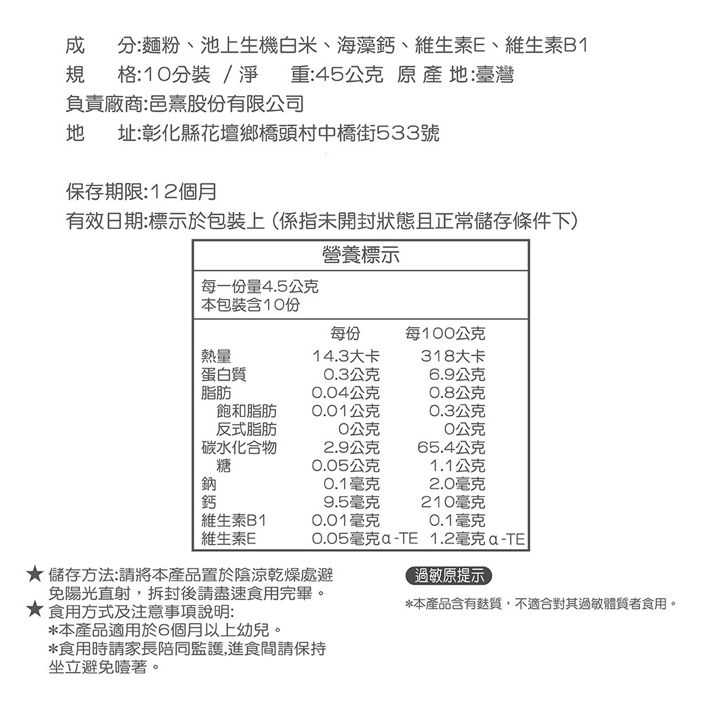 Nnutrinini 脆妮妮 池上米餅,是專為6個月以上寶寶設計的健康零食。採用台灣在地池上米製成,無添加鹽和砂糖,讓寶寶可以安心享用。獨立包裝,方便攜帶,隨時隨地都能給寶寶補充能量。入口即化,進食安全,運用奈米技術將米分子達到最小化,保留原食材的營養成分,不僅能夠入口即化,還能享受到米的香氣。烘烤技術製作,非油炸製品,健康又能享受淡淡米香風味。