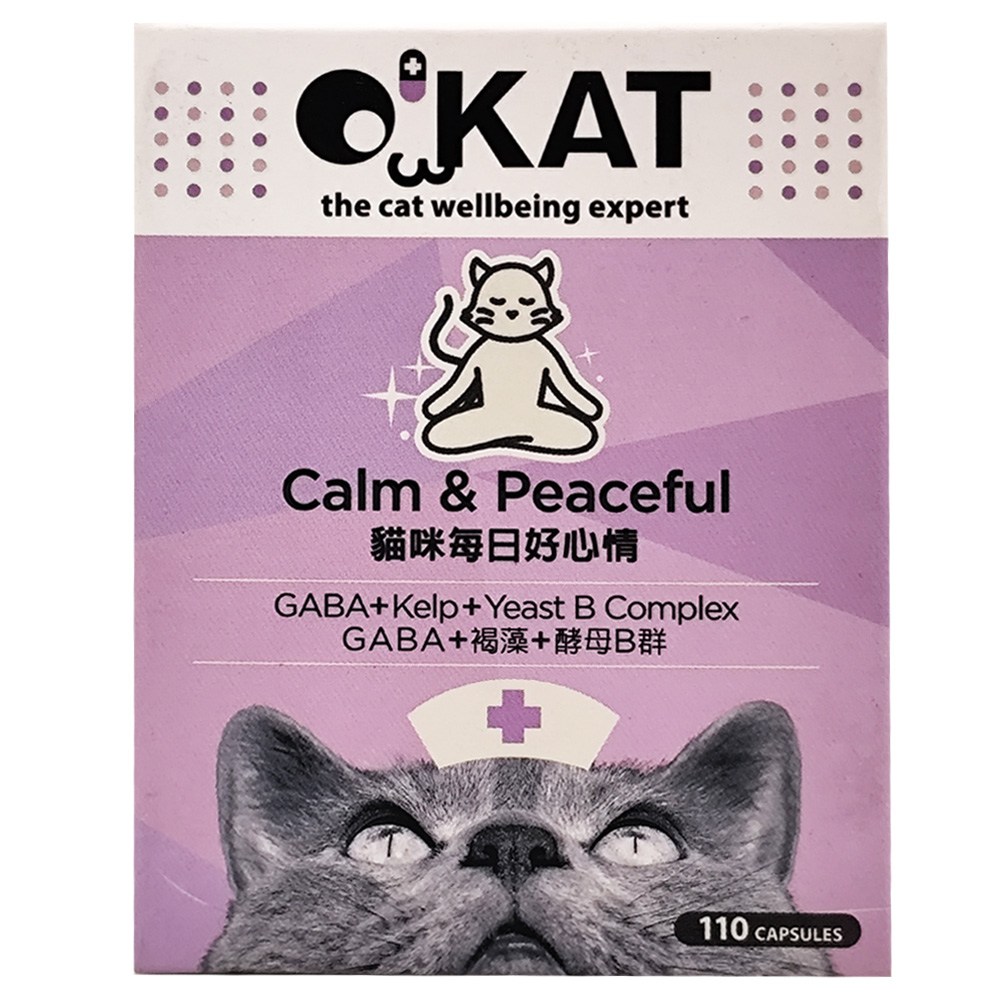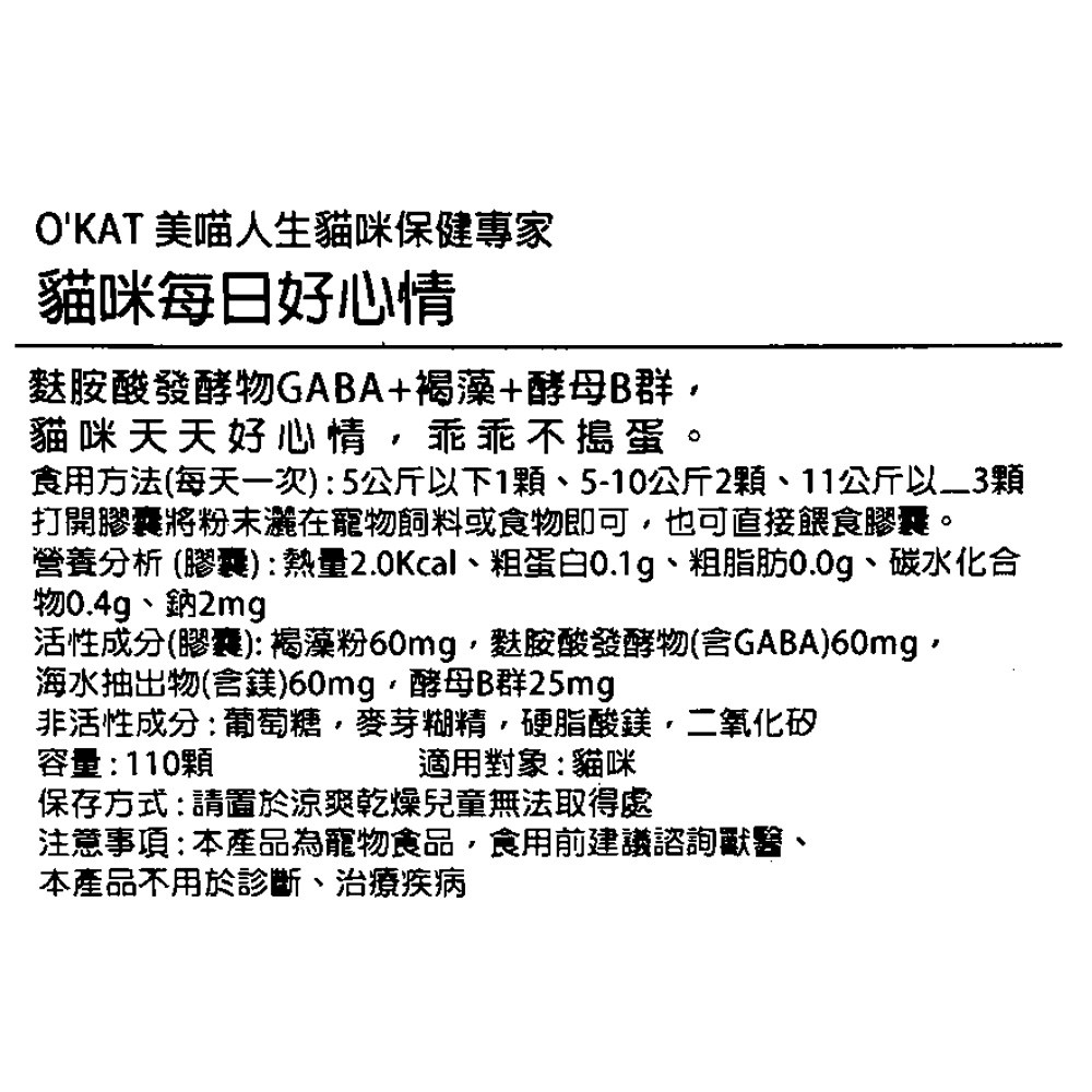 O'KAT 美喵人生貓咪每日好心情,是專為貓咪設計的保健營養品,每盒含110顆膠囊。本產品結合GABA、褐藻與酵母B群,有助於舒緩貓咪的壓力,安撫情緒,並提升注意力,讓貓咪天天保持好心情,乖乖不搗蛋,5公斤以下1顆,5-10公斤2顆,11公斤以上3顆,可直接餵食或混於食物中。O'KAT 貓咪保健專家,為您的愛貓提供全方位的健康呵護。