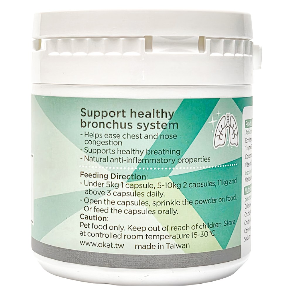 美喵人生貓咪支氣管養護,為您的愛貓提供全方位的呼吸道健康支持。本產品富含紫錐菊、百里香、初乳免疫球蛋白及維生素C等多種超級食物,有效補充支氣管所需營養,增強呼吸道機能。每罐包含110顆膠囊,方便餵食,可直接餵食或混入寵物飼料中。本產品產地台灣,嚴格把關品質,讓您安心守護愛貓的健康。給予您的愛貓穩定且溫和的支氣管呵護,讓牠們呼吸更順暢,生活更健康。