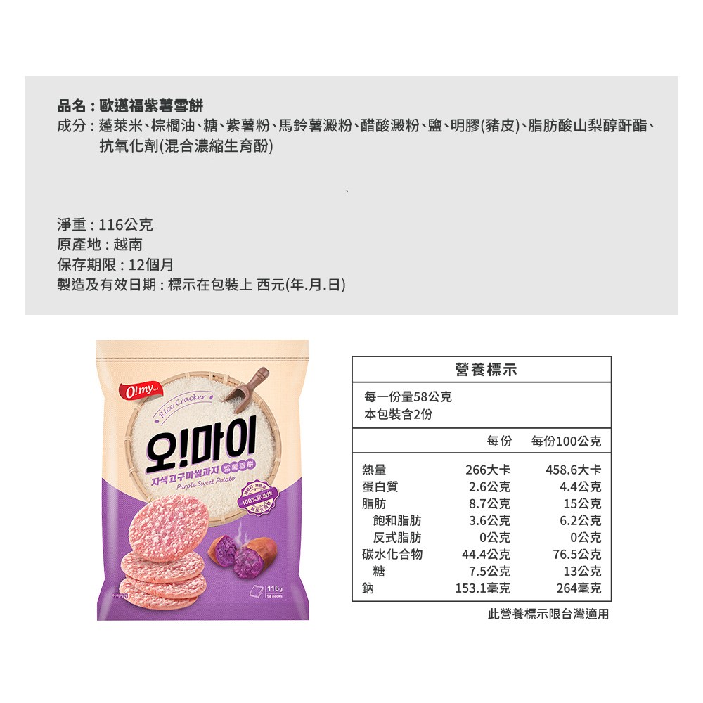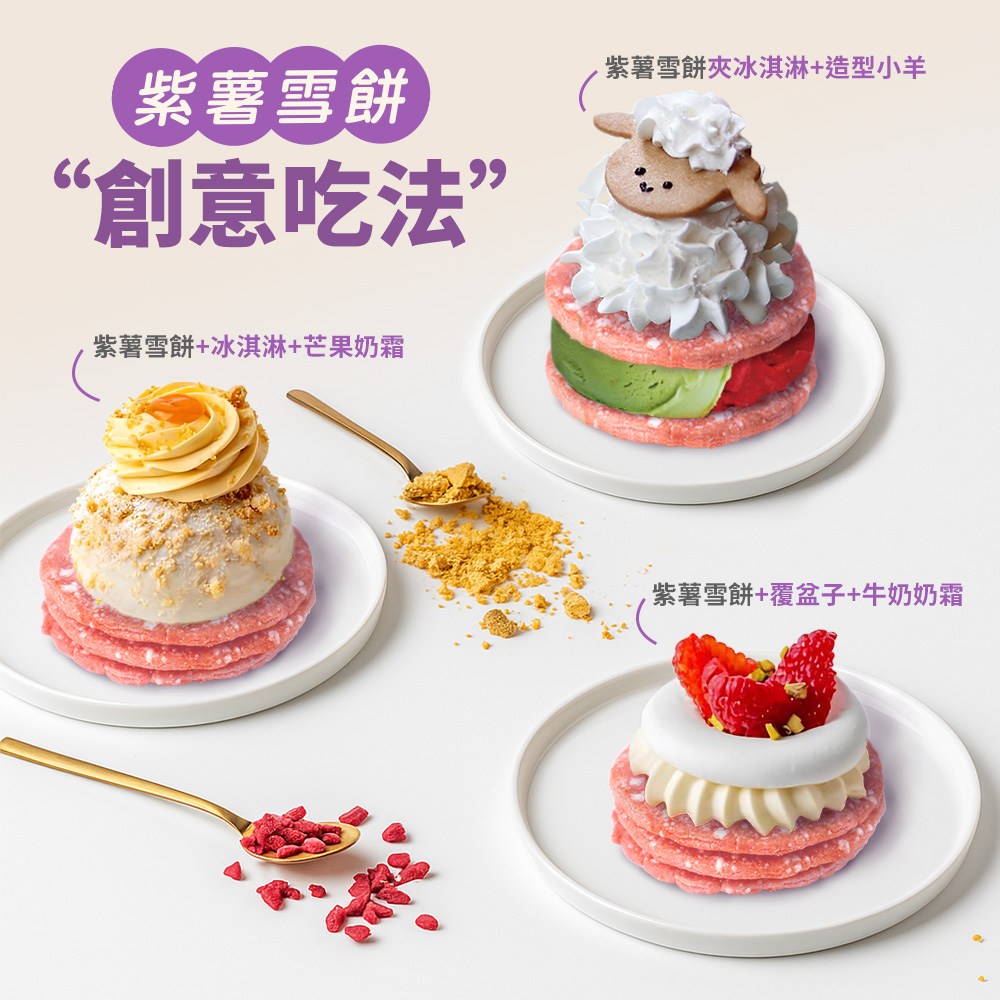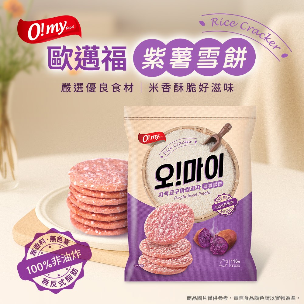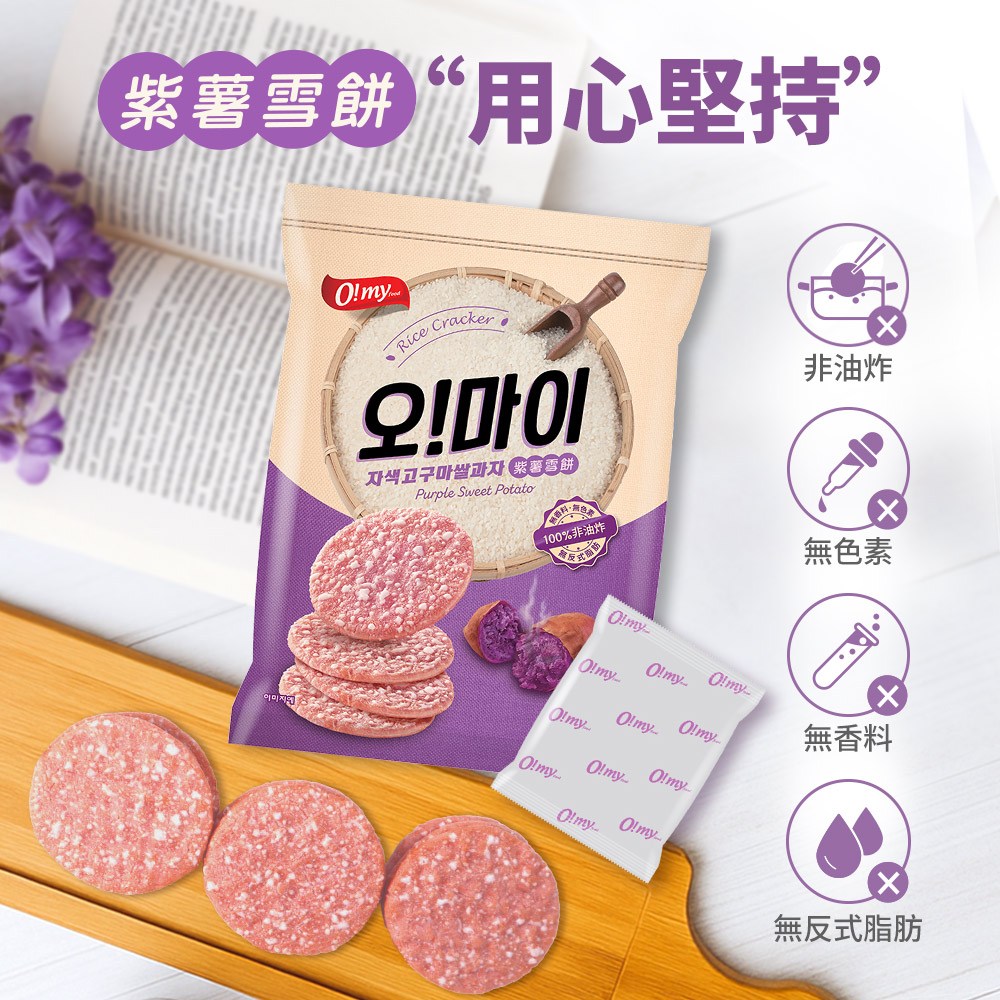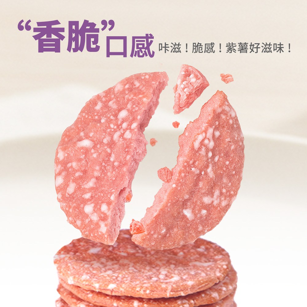 O! my food紫薯雪餅,以非油炸方式製成,保留食材的原始風味與營養。口感酥脆,散發淡淡的紫薯香甜,不含人工色素及反式脂肪,健康無負擔。獨立小包裝設計,方便攜帶與分享,隨時隨地享受美味。無論是搭配冰淇淋、水果,或是直接享用,都能帶來滿足的味蕾體驗,是您休閒時光的最佳良伴。
