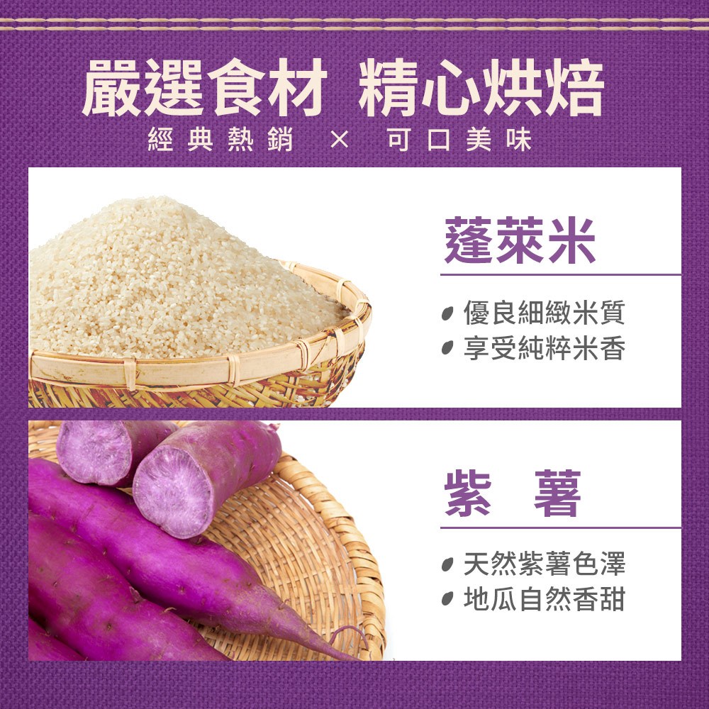 - 嚴選優質紫薯搭配蓬萊米製成,口感豐富,每一口都散發出自然香甜,令人回味無窮。