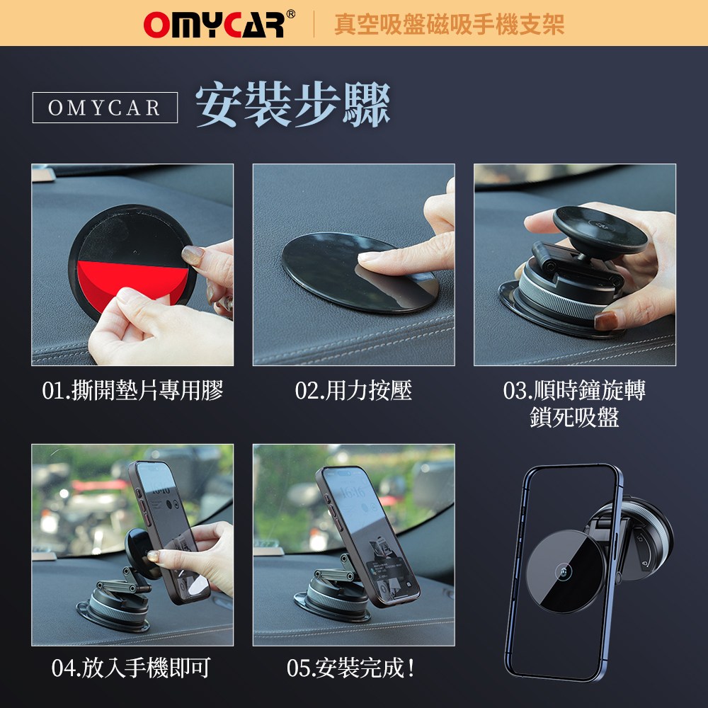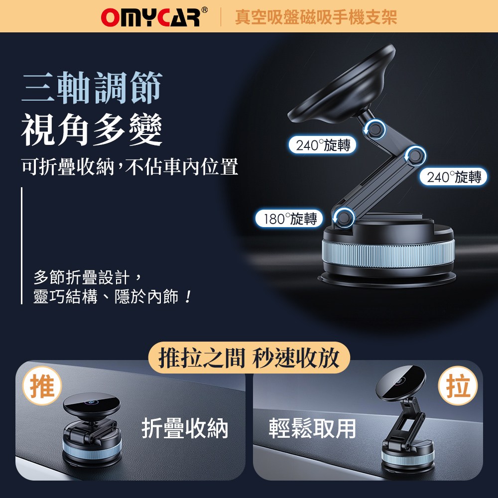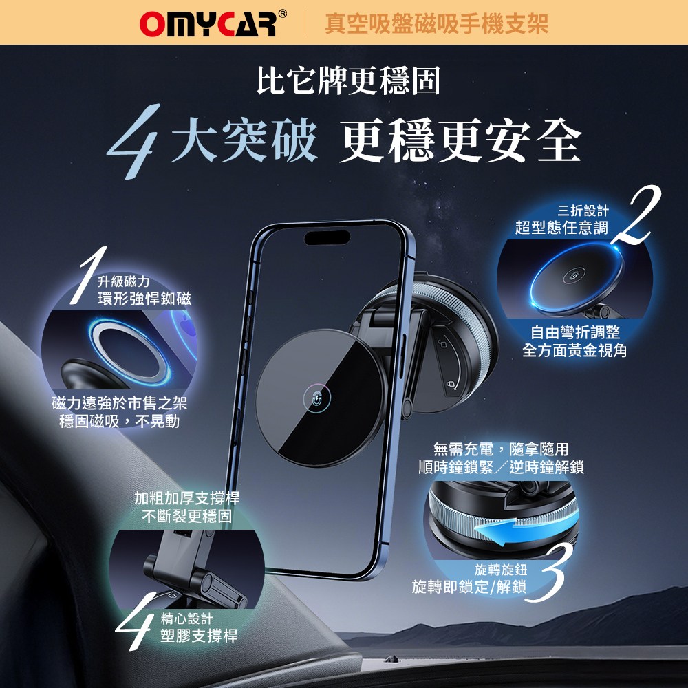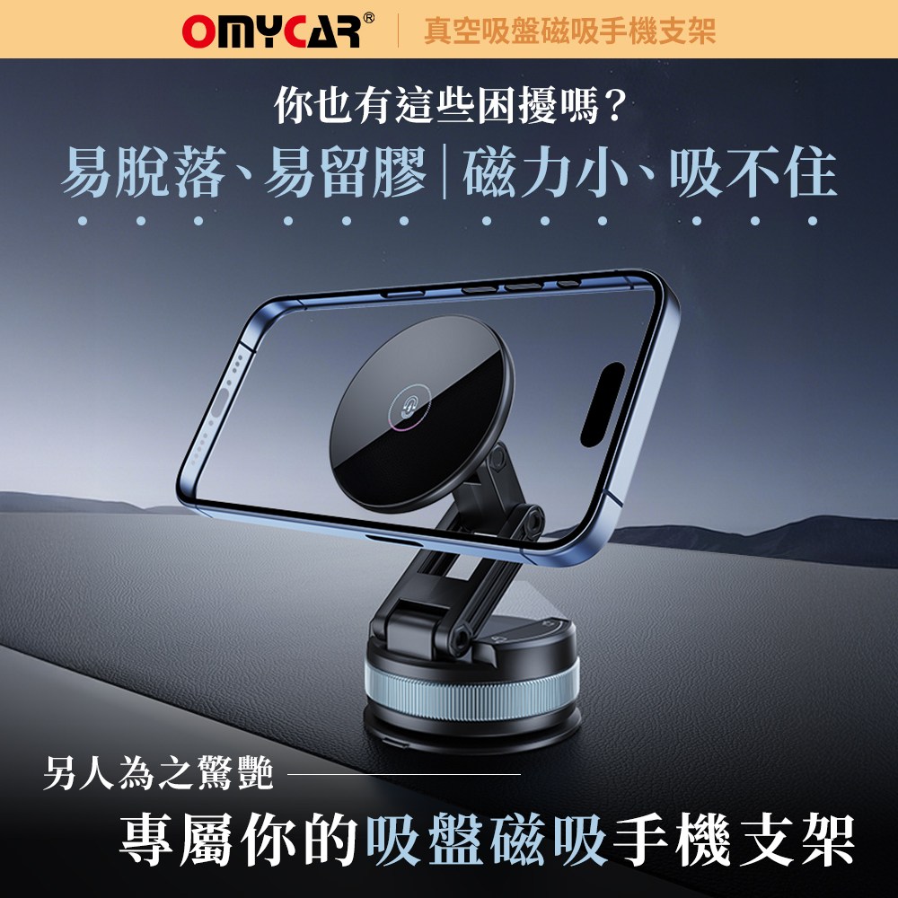 OMyCar真空吸盤磁吸手機支架,採用雙面吸附設計,穩固可靠,讓您在行車過程中也能安全使用手機導航。360度旋轉功能,輕鬆調整至最佳視角,操作更方便。迷你便攜設計,不佔空間,隨時隨地都能使用。免充電設計,省去繁瑣步驟,即裝即用。適用於所有車型,安裝簡單,是您行車的最佳夥伴。