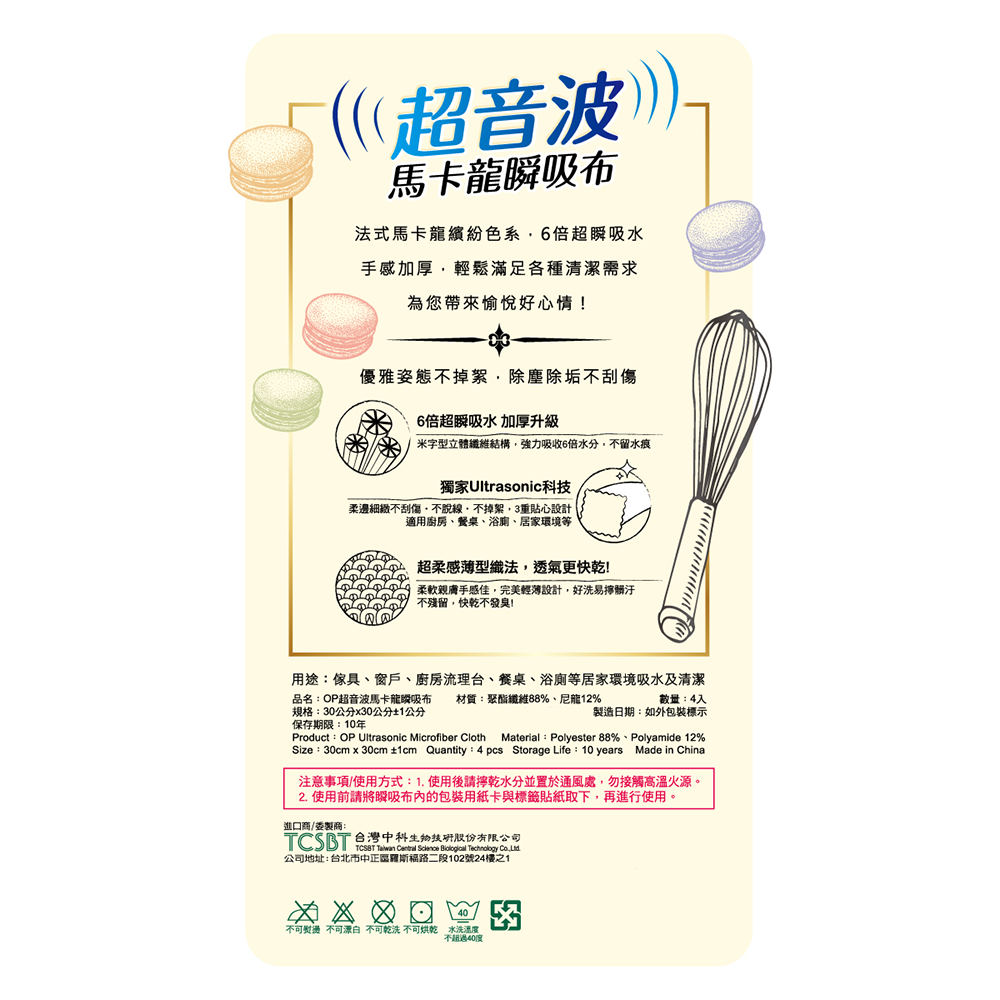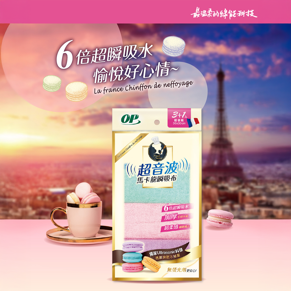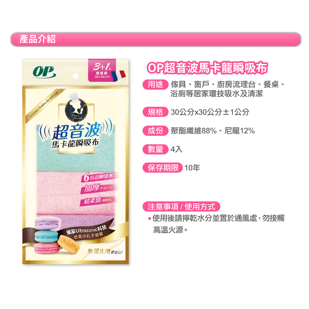 OP 超音波馬卡龍瞬吸布,為您的居家清潔帶來全新體驗。這款30 x 30公分的抹布,一包四條,色彩繽紛,不僅美觀且實用。採用獨家Ultrasonic科技,纖維細緻不刮傷,吸水力超強,能迅速吸乾水分,不留水痕。無論是清潔餐桌、廚房檯面、浴室或家具,都能輕鬆應對。可重複使用,讓您的居家環境隨時保持乾淨舒適。
