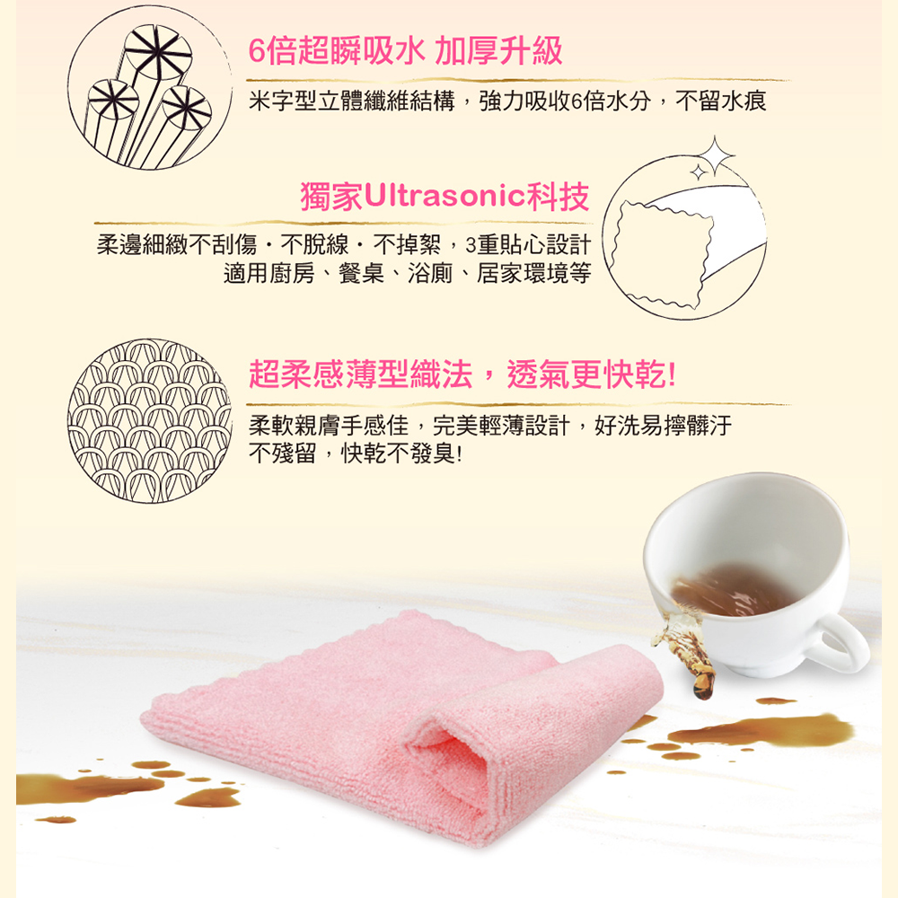 - 超音波技術纖維,觸感柔軟細緻,呵護您的雙手,清潔同時享受舒適。