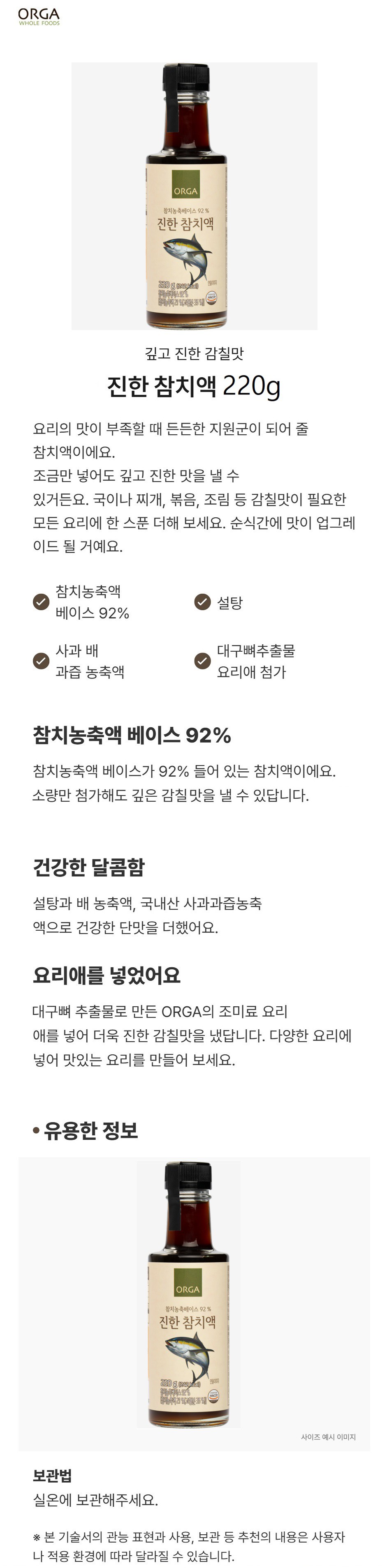 ORGA濃郁鮪魚露採用92%鮪魚濃縮液基底,味道鮮美醇厚,只需少量即可為您的料理帶來豐富的層次感。除了鮪魚的鮮味,更添加了砂糖、梨子濃縮液和韓國產蘋果果汁濃縮液,增添了自然的甜味。此外,更加入了以鱈魚骨萃取物製成的料理露,讓鮮味更加提升。無論是湯品、燉菜、炒菜或滷味,加入一匙鮪魚露,都能讓美味瞬間升級,是您廚房中不可或缺的調味好幫手。