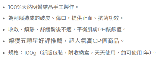 - 刮鬍後使用,感受明礬石帶來的清涼舒爽,鎮靜肌膚,告別不適感。