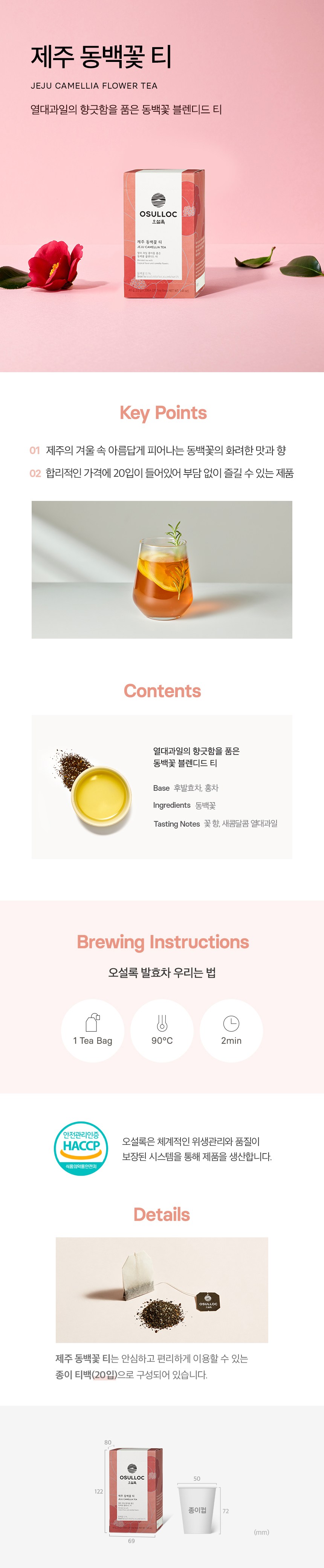 - 獨立茶包設計,方便沖泡,隨時隨地享受一杯暖心山茶花茶,感受來自濟州島的甜蜜滋味。